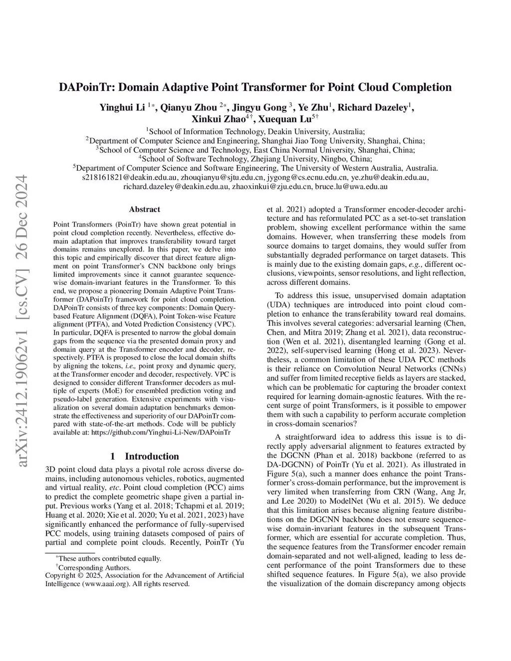 DAPoinTr: Domain Adaptive Point Transformer for Point Cloud Completion