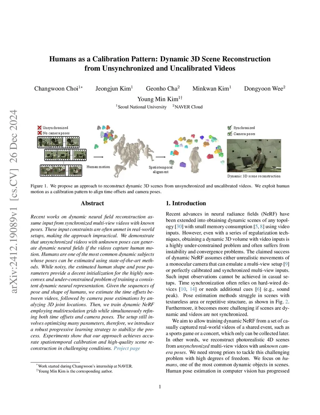 Recent works on dynamic 3D neural field reconstruction assume the input from synchronized multi-view videos whose poses are known. The input constraints are often not satisfied in real-world setups, making the approach impractical. We show that unsynchronized videos from unknown poses can generate dynamic neural fields as long as the videos capture human motion. Humans are one of the most common dynamic subjects captured in videos, and their shapes and poses can be estimated using state-of-the-art libraries. While noisy, the estimated human shape and pose parameters provide a decent initialization point to start the highly non-convex and under-constrained problem of training a consistent dynamic neural representation. Given the shape and pose parameters of humans in individual frames, we formulate methods to calculate the time offsets between videos, followed by camera pose estimations that analyze the 3D joint positions. Then, we train the dynamic neural fields employing multiresolution grids while we concurrently refine both time offsets and camera poses. The setup still involves optimizing many parameters; therefore, we introduce a robust progressive learning strategy to stabilize the process. Experiments show that our approach achieves accurate spatio-temporal calibration and high-quality scene reconstruction in challenging conditions.