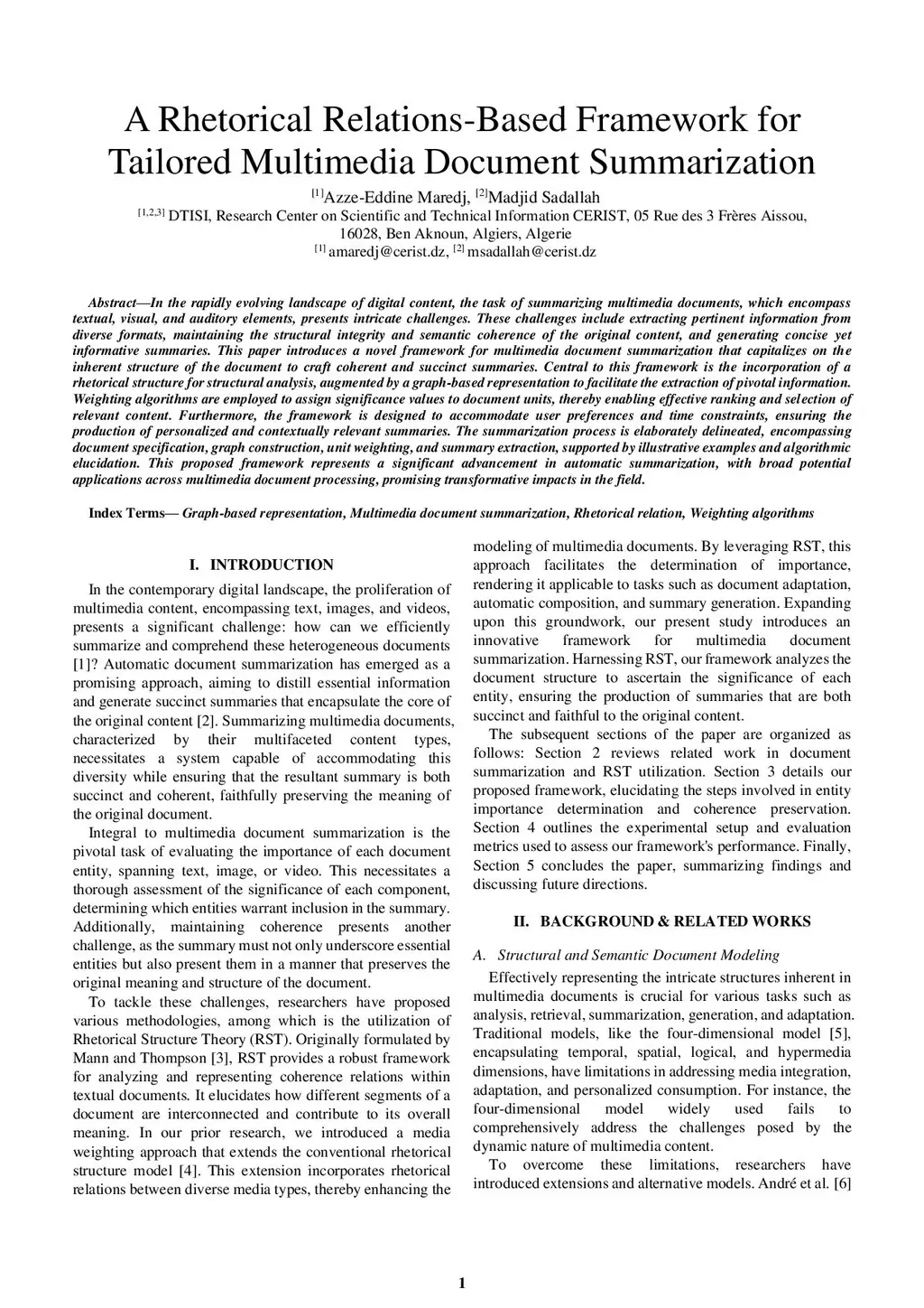 In the rapidly evolving landscape of digital content, the task of summarizing multimedia documents, which encompass textual, visual, and auditory elements, presents intricate challenges. These challenges include extracting pertinent information from diverse formats, maintaining the structural integrity and semantic coherence of the original content, and generating concise yet informative summaries. This paper introduces a novel framework for multimedia document summarization that capitalizes on the inherent structure of the document to craft coherent and succinct summaries. Central to this framework is the incorporation of a rhetorical structure for structural analysis, augmented by a graph-based representation to facilitate the extraction of pivotal information. Weighting algorithms are employed to assign significance values to document units, thereby enabling effective ranking and selection of relevant content. Furthermore, the framework is designed to accommodate user preferences and time constraints, ensuring the production of personalized and contextually relevant summaries. The summarization process is elaborately delineated, encompassing document specification, graph construction, unit weighting, and summary extraction, supported by illustrative examples and algorithmic elucidation. This proposed framework represents a significant advancement in automatic summarization, with broad potential applications across multimedia document processing, promising transformative impacts in the field.