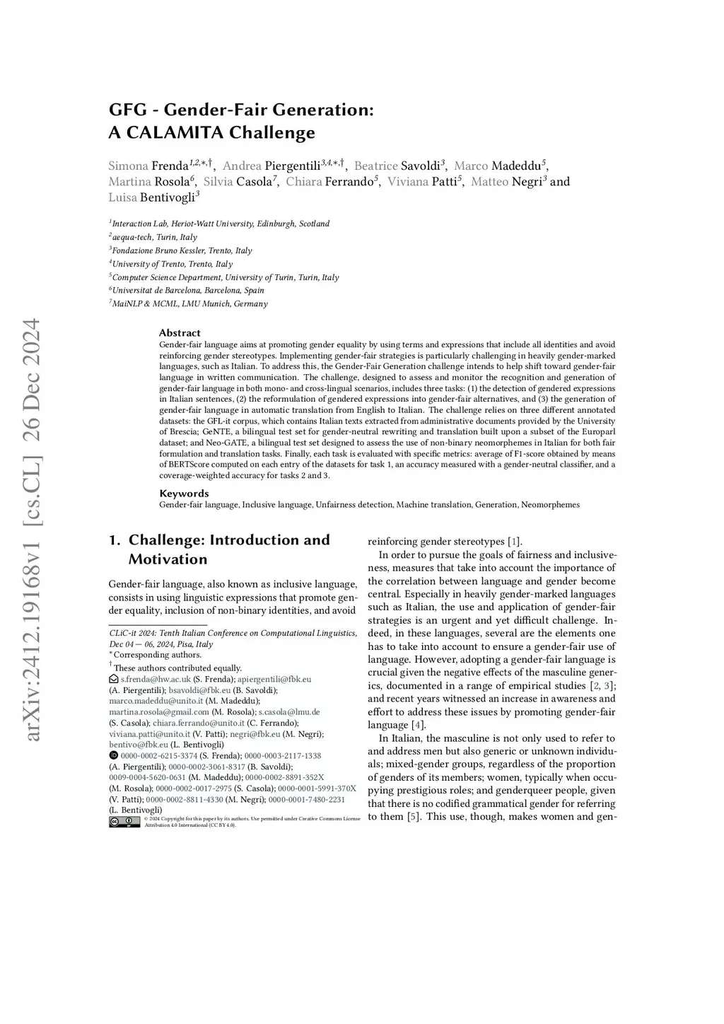 Gender-fair language aims at promoting gender equality by using terms and expressions that include all identities and avoid reinforcing gender stereotypes. Implementing gender-fair strategies is particularly challenging in heavily gender-marked languages, such as Italian. To address this, the Gender-Fair Generation challenge intends to help shift toward gender-fair language in written communication. The challenge, designed to assess and monitor the recognition and generation of gender-fair language in both mono- and cross-lingual scenarios, includes three tasks: (1) the detection of gendered expressions in Italian sentences, (2) the reformulation of gendered expressions into gender-fair alternatives, and (3) the generation of gender-fair language in automatic translation from English to Italian. The challenge relies on three different annotated datasets: the GFL-it corpus, which contains Italian texts extracted from administrative documents provided by the University of Brescia; GeNTE, a bilingual test set for gender-neutral rewriting and translation built upon a subset of the Europarl dataset; and Neo-GATE, a bilingual test set designed to assess the use of non-binary neomorphemes in Italian for both fair formulation and translation tasks. Finally, each task is evaluated with specific metrics: average of F1-score obtained by means of BERTScore computed on each entry of the datasets for task 1, an accuracy measured with a gender-neutral classifier, and a coverage-weighted accuracy for tasks 2 and 3.