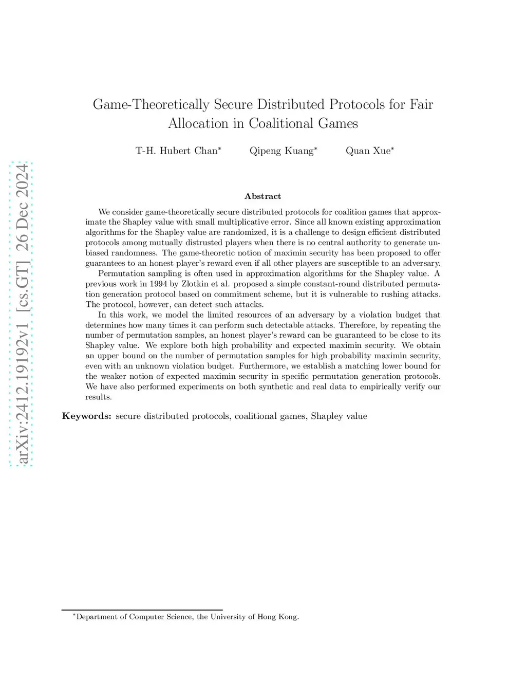 We consider game-theoretically secure distributed protocols for coalition games that approximate the Shapley value with small multiplicative error. Since all known existing approximation algorithms for the Shapley value are randomized, it is a challenge to design efficient distributed protocols among mutually distrusted players when there is no central authority to generate unbiased randomness. The game-theoretic notion of maximin security has been proposed to offer guarantees to an honest player's reward even if all other players are susceptible to an adversary. Permutation sampling is often used in approximation algorithms for the Shapley value. A previous work in 1994 by Zlotkin et al. proposed a simple constant-round distributed permutation generation protocol based on commitment scheme, but it is vulnerable to rushing attacks. The protocol, however, can detect such attacks. In this work, we model the limited resources of an adversary by a violation budget that determines how many times it can perform such detectable attacks. Therefore, by repeating the number of permutation samples, an honest player's reward can be guaranteed to be close to its Shapley value. We explore both high probability and expected maximin security. We obtain an upper bound on the number of permutation samples for high probability maximin security, even with an unknown violation budget. Furthermore, we establish a matching lower bound for the weaker notion of expected maximin security in specific permutation generation protocols. We have also performed experiments on both synthetic and real data to empirically verify our results.