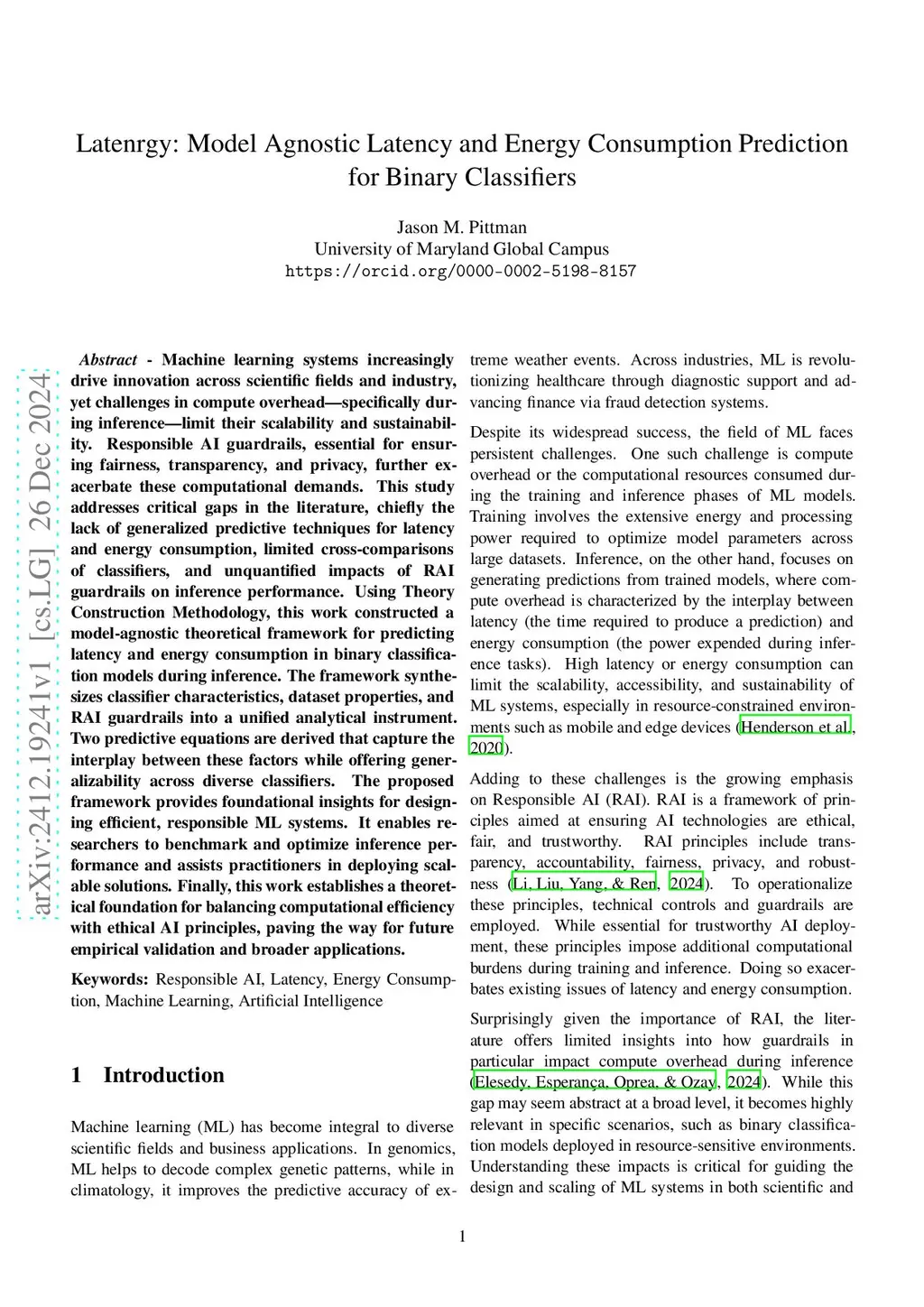 Machine learning systems increasingly drive innovation across scientific fields and industry, yet challenges in compute overhead, specifically during inference, limit their scalability and sustainability. Responsible AI guardrails, essential for ensuring fairness, transparency, and privacy, further exacerbate these computational demands. This study addresses critical gaps in the literature, chiefly the lack of generalized predictive techniques for latency and energy consumption, limited cross-comparisons of classifiers, and unquantified impacts of RAI guardrails on inference performance. Using Theory Construction Methodology, this work constructed a model-agnostic theoretical framework for predicting latency and energy consumption in binary classification models during inference. The framework synthesizes classifier characteristics, dataset properties, and RAI guardrails into a unified analytical instrument. Two predictive equations are derived that capture the interplay between these factors while offering generalizability across diverse classifiers. The proposed framework provides foundational insights for designing efficient, responsible ML systems. It enables researchers to benchmark and optimize inference performance and assists practitioners in deploying scalable solutions. Finally, this work establishes a theoretical foundation for balancing computational efficiency with ethical AI principles, paving the way for future empirical validation and broader applications.