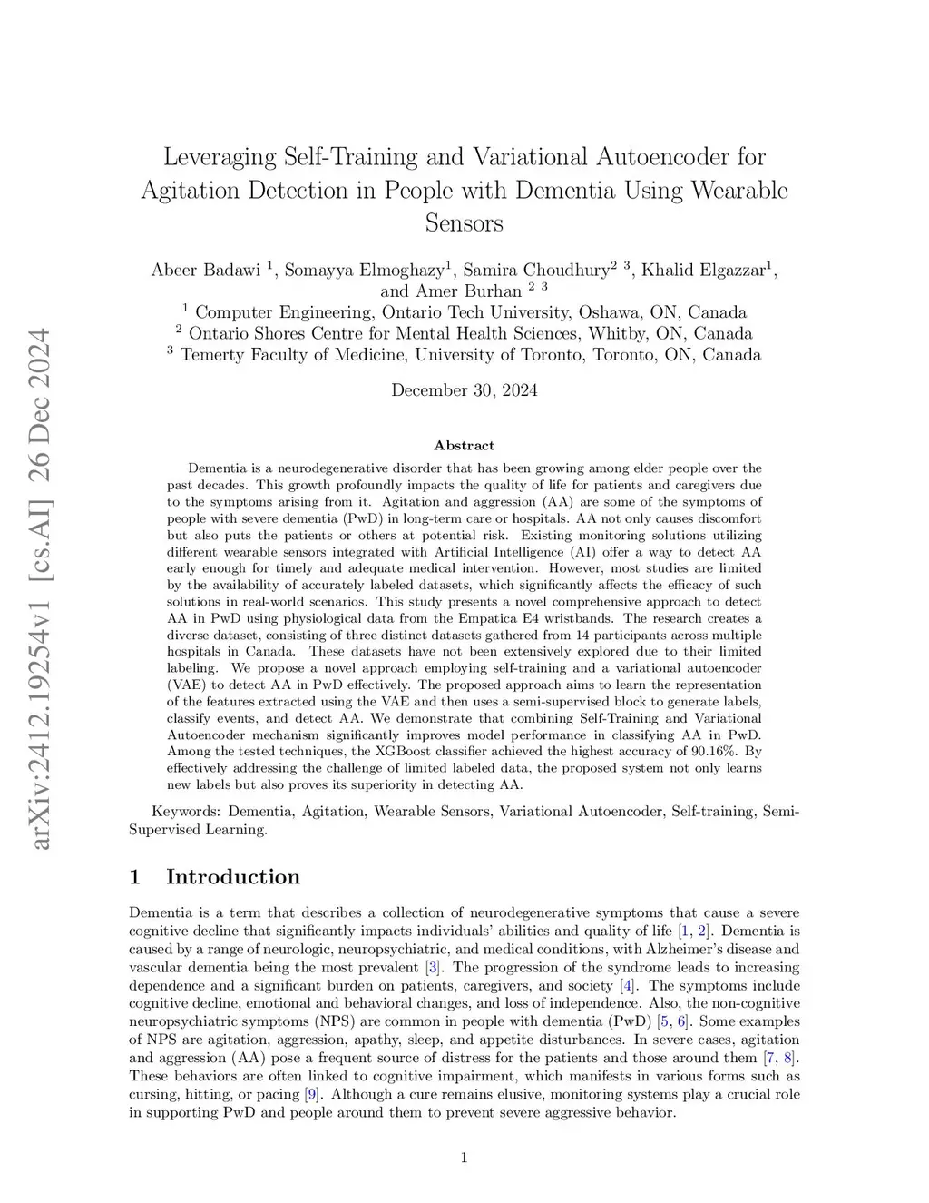 Dementia is a neurodegenerative disorder that has been growing among elder people over the past decades. This growth profoundly impacts the quality of life for patients and caregivers due to the symptoms arising from it. Agitation and aggression (AA) are some of the symptoms of people with severe dementia (PwD) in long-term care or hospitals. AA not only causes discomfort but also puts the patients or others at potential risk. Existing monitoring solutions utilizing different wearable sensors integrated with Artificial Intelligence (AI) offer a way to detect AA early enough for timely and adequate medical intervention. However, most studies are limited by the availability of accurately labeled datasets, which significantly affects the efficacy of such solutions in real-world scenarios. This study presents a novel comprehensive approach to detect AA in PwD using physiological data from the Empatica E4 wristbands. The research creates a diverse dataset, consisting of three distinct datasets gathered from 14 participants across multiple hospitals in Canada. These datasets have not been extensively explored due to their limited labeling. We propose a novel approach employing self-training and a variational autoencoder (VAE) to detect AA in PwD effectively. The proposed approach aims to learn the representation of the features extracted using the VAE and then uses a semi-supervised block to generate labels, classify events, and detect AA. We demonstrate that combining Self-Training and Variational Autoencoder mechanism significantly improves model performance in classifying AA in PwD. Among the tested techniques, the XGBoost classifier achieved the highest accuracy of 90.16\%. By effectively addressing the challenge of limited labeled data, the proposed system not only learns new labels but also proves its superiority in detecting AA.