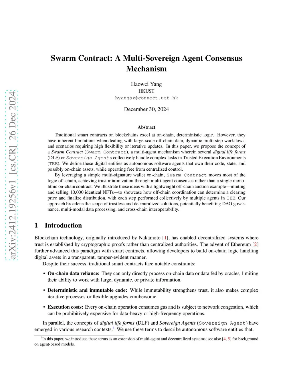 Traditional smart contracts on blockchains excel at on-chain, deterministic logic. However, they have inherent limitations when dealing with large-scale off-chain data, dynamic multi-step workflows, and scenarios requiring high flexibility or iterative updates. In this paper, we propose the concept of a "Swarm Contract" (Swarm), a multi-agent mechanism wherein several digital life forms (DLF) or Sovereign Agents (SA) collectively handle complex tasks in Trusted Execution Environments (TEE). These digital entities are defined as autonomous software agents that own their code, state, and possibly on-chain assets, while operating free from centralized control. By leveraging a simple multi-signature wallet on-chain, Swarm moves most of the logic off-chain, achieving trust minimization through multi-agent consensus rather than a single monolithic on-chain contract. We illustrate these ideas with a lightweight off-chain auction example - minting and selling 10,000 identical NFTs - to showcase how off-chain coordination can determine a clearing price and finalize distribution, with each step performed collectively by multiple agents in TEE. This approach broadens the scope of trustless and decentralized solutions, potentially benefiting DAO governance, multi-modal data processing, and cross-chain interoperability.