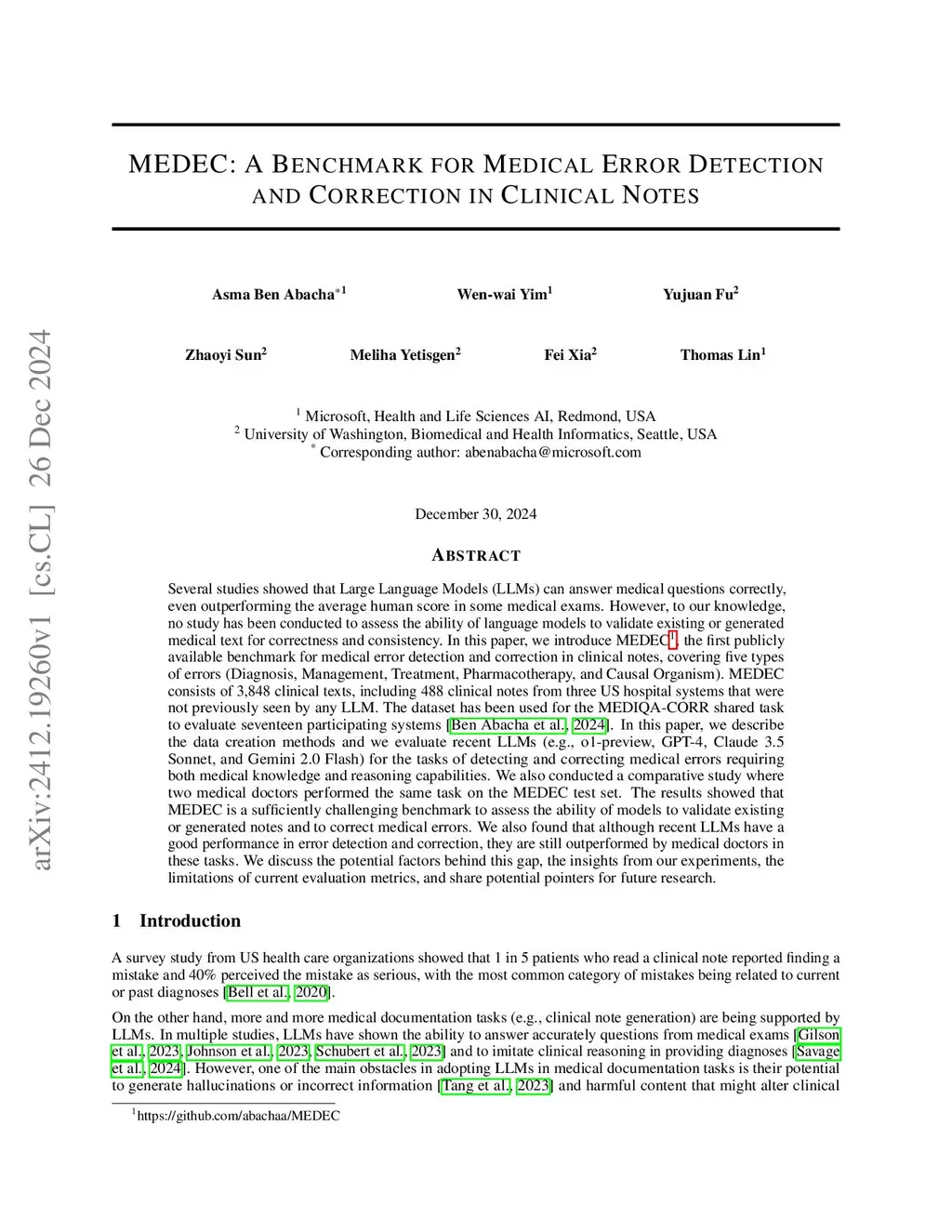 Several studies showed that Large Language Models (LLMs) can answer medical questions correctly, even outperforming the average human score in some medical exams. However, to our knowledge, no study has been conducted to assess the ability of language models to validate existing or generated medical text for correctness and consistency. In this paper, we introduce MEDEC (this https URL), the first publicly available benchmark for medical error detection and correction in clinical notes, covering five types of errors (Diagnosis, Management, Treatment, Pharmacotherapy, and Causal Organism). MEDEC consists of 3,848 clinical texts, including 488 clinical notes from three US hospital systems that were not previously seen by any LLM. The dataset has been used for the MEDIQA-CORR shared task to evaluate seventeen participating systems [Ben Abacha et al., 2024]. In this paper, we describe the data creation methods and we evaluate recent LLMs (e.g., o1-preview, GPT-4, Claude 3.5 Sonnet, and Gemini 2.0 Flash) for the tasks of detecting and correcting medical errors requiring both medical knowledge and reasoning capabilities. We also conducted a comparative study where two medical doctors performed the same task on the MEDEC test set. The results showed that MEDEC is a sufficiently challenging benchmark to assess the ability of models to validate existing or generated notes and to correct medical errors. We also found that although recent LLMs have a good performance in error detection and correction, they are still outperformed by medical doctors in these tasks. We discuss the potential factors behind this gap, the insights from our experiments, the limitations of current evaluation metrics, and share potential pointers for future research.