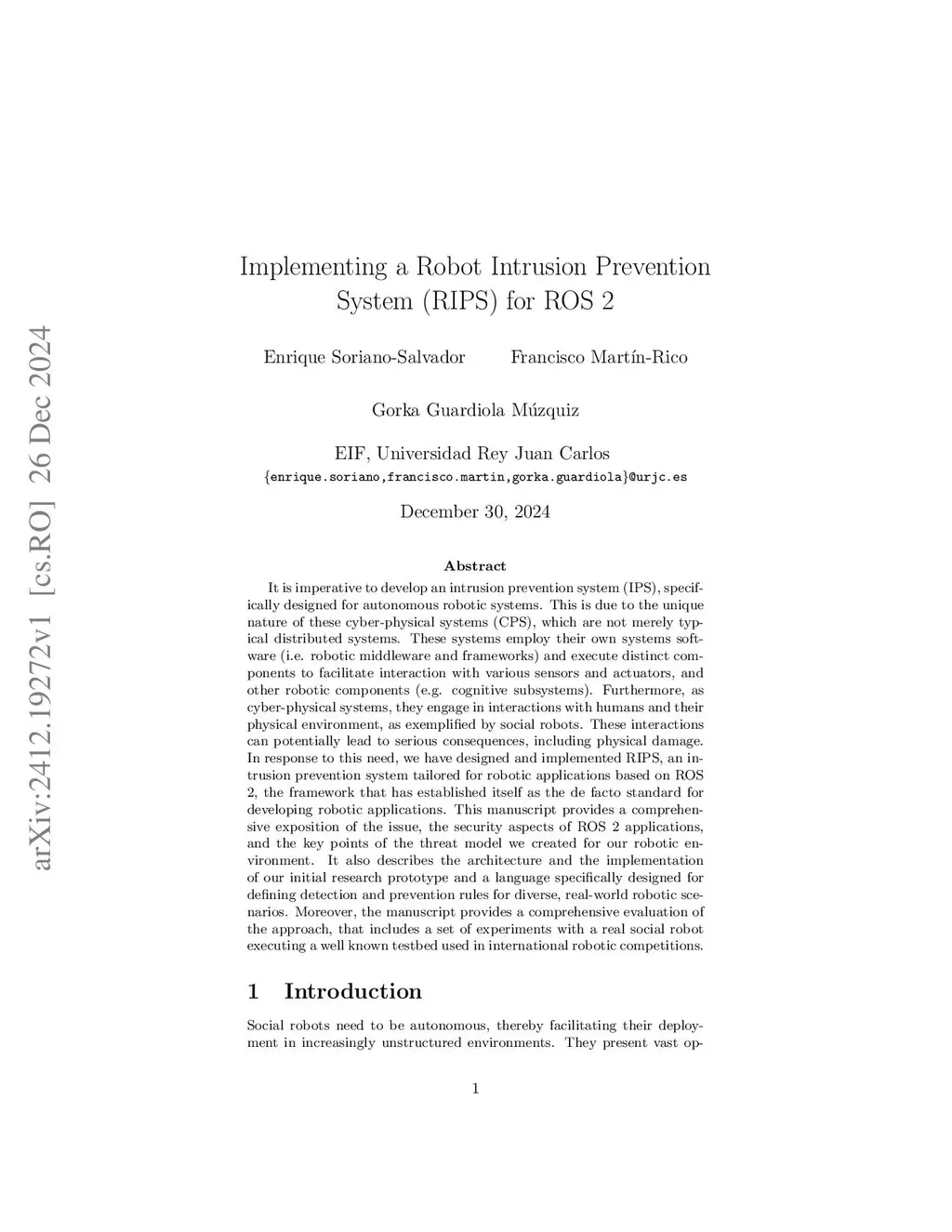 It is imperative to develop an intrusion prevention system (IPS), specifically designed for autonomous robotic systems. This is due to the unique nature of these cyber-physical systems (CPS), which are not merely typical distributed systems. These systems employ their own systems software (i.e. robotic middleware and frameworks) and execute distinct components to facilitate interaction with various sensors and actuators, and other robotic components (e.g. cognitive subsystems). Furthermore, as cyber-physical systems, they engage in interactions with humans and their physical environment, as exemplified by social robots. These interactions can potentially lead to serious consequences, including physical damage. In response to this need, we have designed and implemented RIPS, an intrusion prevention system tailored for robotic applications based on ROS 2, the framework that has established itself as the de facto standard for developing robotic applications. This manuscript provides a comprehensive exposition of the issue, the security aspects of ROS 2 applications, and the key points of the threat model we created for our robotic environment. It also describes the architecture and the implementation of our initial research prototype and a language specifically designed for defining detection and prevention rules for diverse, real-world robotic scenarios. Moreover, the manuscript provides a comprehensive evaluation of the approach, that includes a set of experiments with a real social robot executing a well known testbed used in international robotic competitions.