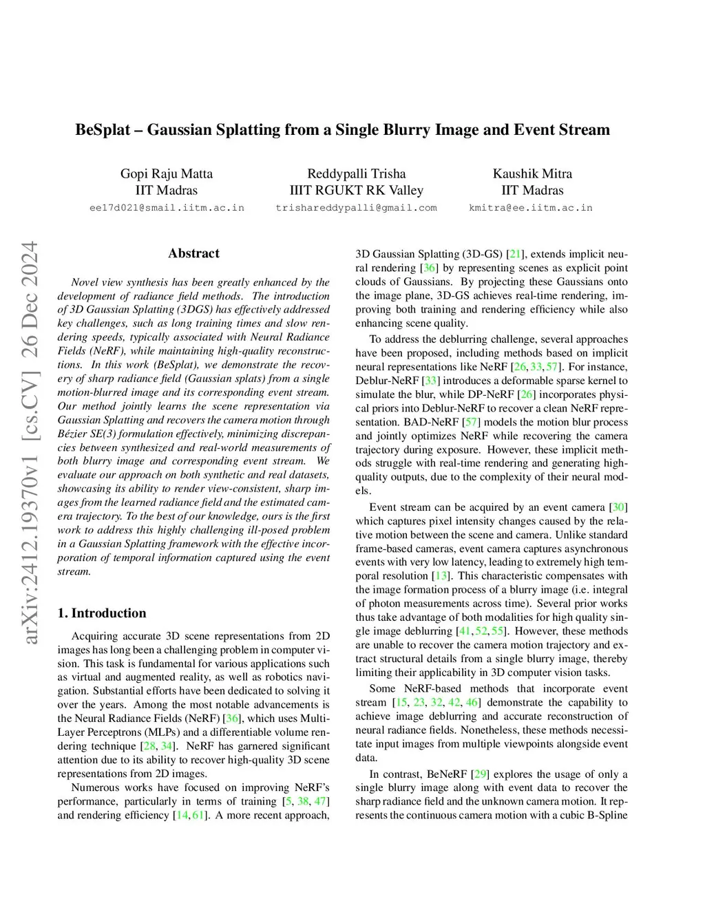 Novel view synthesis has been greatly enhanced by the development of radiance field methods. The introduction of 3D Gaussian Splatting (3DGS) has effectively addressed key challenges, such as long training times and slow rendering speeds, typically associated with Neural Radiance Fields (NeRF), while maintaining high-quality reconstructions. In this work (BeSplat), we demonstrate the recovery of sharp radiance field (Gaussian splats) from a single motion-blurred image and its corresponding event stream. Our method jointly learns the scene representation via Gaussian Splatting and recovers the camera motion through Bezier SE(3) formulation effectively, minimizing discrepancies between synthesized and real-world measurements of both blurry image and corresponding event stream. We evaluate our approach on both synthetic and real datasets, showcasing its ability to render view-consistent, sharp images from the learned radiance field and the estimated camera trajectory. To the best of our knowledge, ours is the first work to address this highly challenging ill-posed problem in a Gaussian Splatting framework with the effective incorporation of temporal information captured using the event stream.