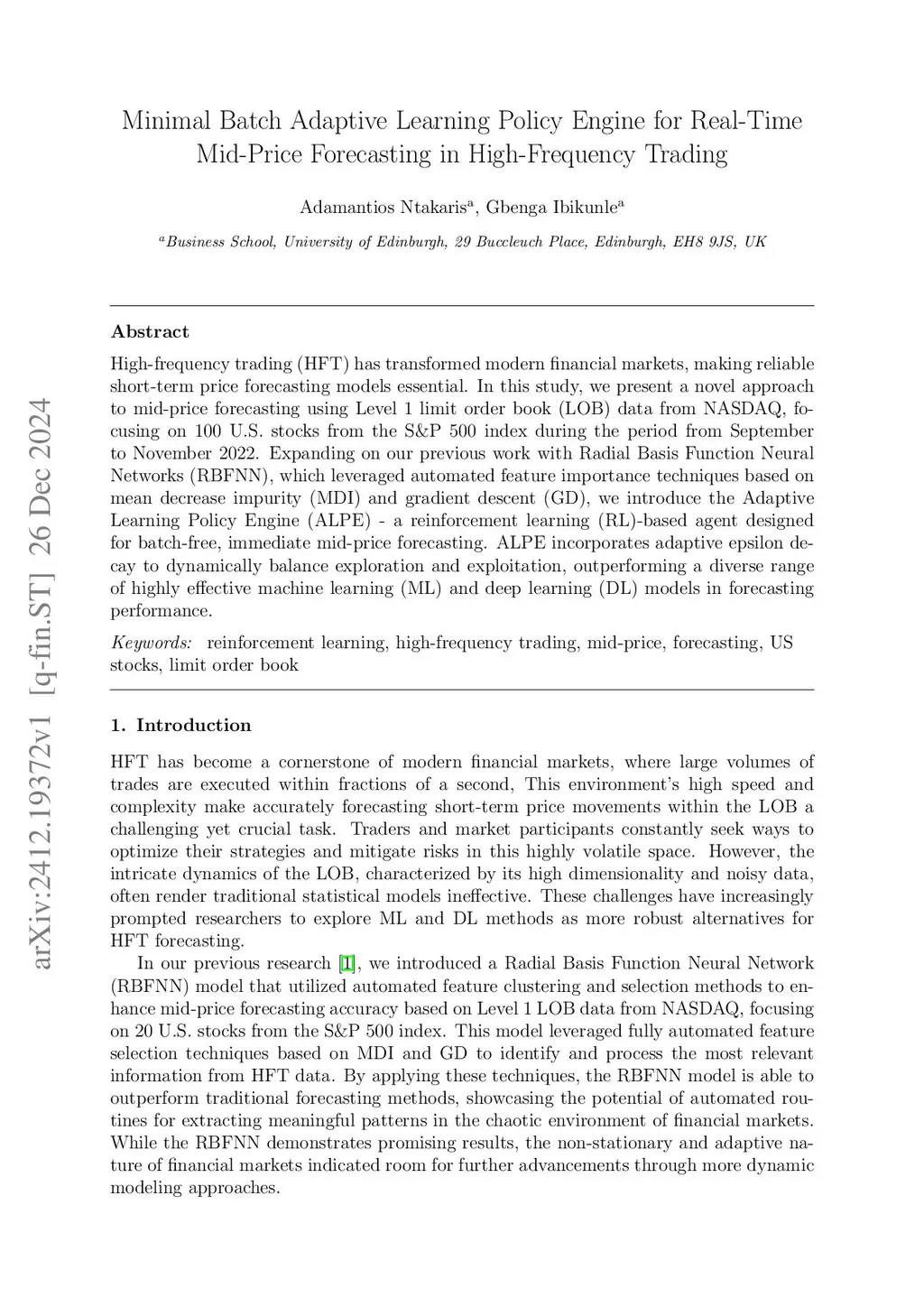 High-frequency trading (HFT) has transformed modern financial markets, making reliable short-term price forecasting models essential. In this study, we present a novel approach to mid-price forecasting using Level 1 limit order book (LOB) data from NASDAQ, focusing on 100 U.S. stocks from the S&P 500 index during the period from September to November 2022. Expanding on our previous work with Radial Basis Function Neural Networks (RBFNN), which leveraged automated feature importance techniques based on mean decrease impurity (MDI) and gradient descent (GD), we introduce the Adaptive Learning Policy Engine (ALPE) - a reinforcement learning (RL)-based agent designed for batch-free, immediate mid-price forecasting. ALPE incorporates adaptive epsilon decay to dynamically balance exploration and exploitation, outperforming a diverse range of highly effective machine learning (ML) and deep learning (DL) models in forecasting performance.