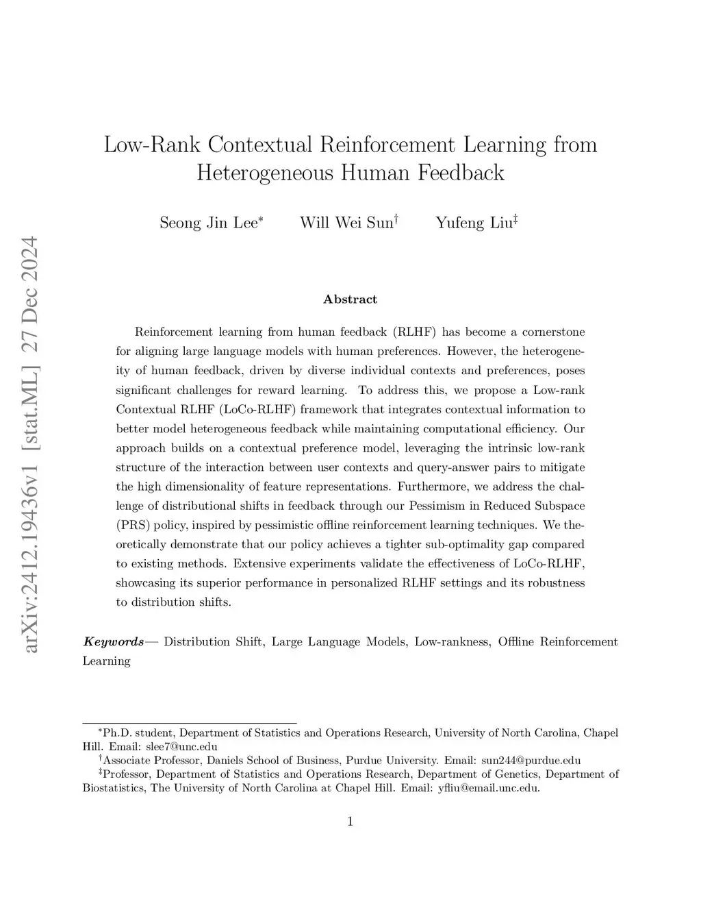 Reinforcement learning from human feedback (RLHF) has become a cornerstone for aligning large language models with human preferences. However, the heterogeneity of human feedback, driven by diverse individual contexts and preferences, poses significant challenges for reward learning. To address this, we propose a Low-rank Contextual RLHF (LoCo-RLHF) framework that integrates contextual information to better model heterogeneous feedback while maintaining computational efficiency. Our approach builds on a contextual preference model, leveraging the intrinsic low-rank structure of the interaction between user contexts and query-answer pairs to mitigate the high dimensionality of feature representations. Furthermore, we address the challenge of distributional shifts in feedback through our Pessimism in Reduced Subspace (PRS) policy, inspired by pessimistic offline reinforcement learning techniques. We theoretically demonstrate that our policy achieves a tighter sub-optimality gap compared to existing methods. Extensive experiments validate the effectiveness of LoCo-RLHF, showcasing its superior performance in personalized RLHF settings and its robustness to distribution shifts.