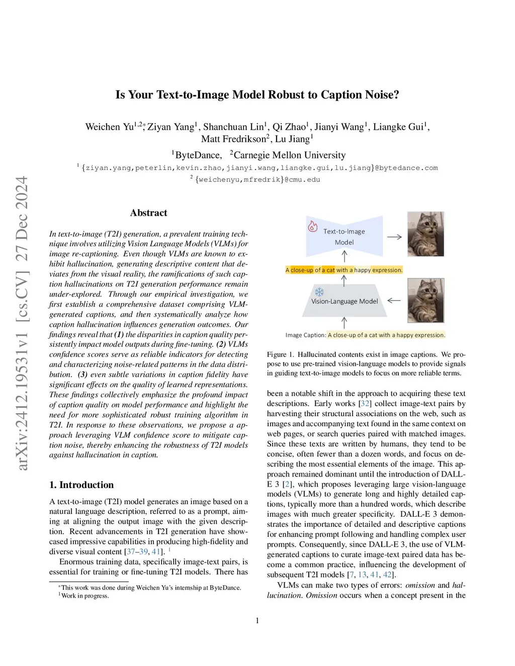 In text-to-image (T2I) generation, a prevalent training technique involves utilizing Vision Language Models (VLMs) for image re-captioning. Even though VLMs are known to exhibit hallucination, generating descriptive content that deviates from the visual reality, the ramifications of such caption hallucinations on T2I generation performance remain under-explored. Through our empirical investigation, we first establish a comprehensive dataset comprising VLM-generated captions, and then systematically analyze how caption hallucination influences generation outcomes. Our findings reveal that (1) the disparities in caption quality persistently impact model outputs during fine-tuning. (2) VLMs confidence scores serve as reliable indicators for detecting and characterizing noise-related patterns in the data distribution. (3) even subtle variations in caption fidelity have significant effects on the quality of learned representations. These findings collectively emphasize the profound impact of caption quality on model performance and highlight the need for more sophisticated robust training algorithm in T2I. In response to these observations, we propose a approach leveraging VLM confidence score to mitigate caption noise, thereby enhancing the robustness of T2I models against hallucination in caption.