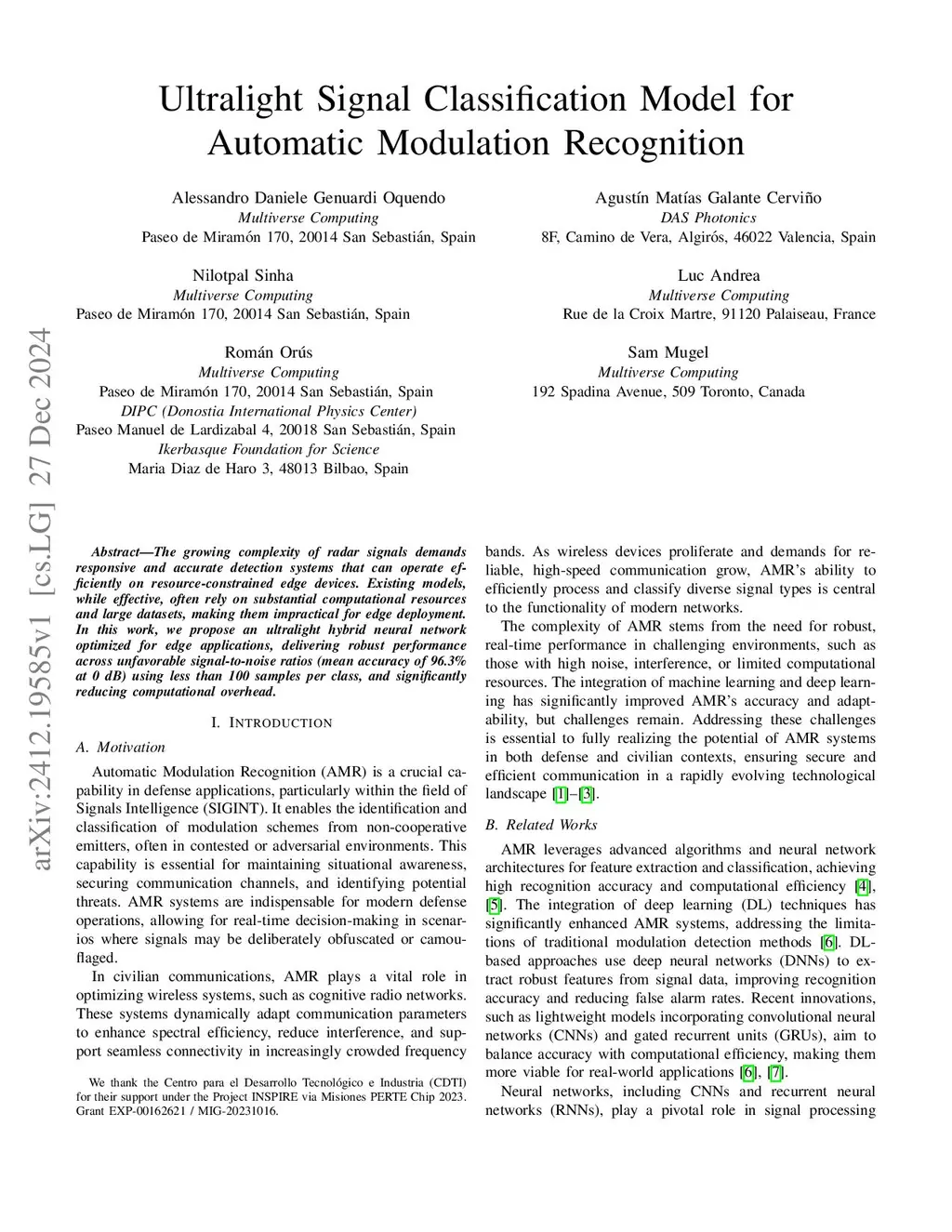 The growing complexity of radar signals demands responsive and accurate detection systems that can operate efficiently on resource-constrained edge devices. Existing models, while effective, often rely on substantial computational resources and large datasets, making them impractical for edge deployment. In this work, we propose an ultralight hybrid neural network optimized for edge applications, delivering robust performance across unfavorable signal-to-noise ratios (mean accuracy of 96.3% at 0 dB) using less than 100 samples per class, and significantly reducing computational overhead.