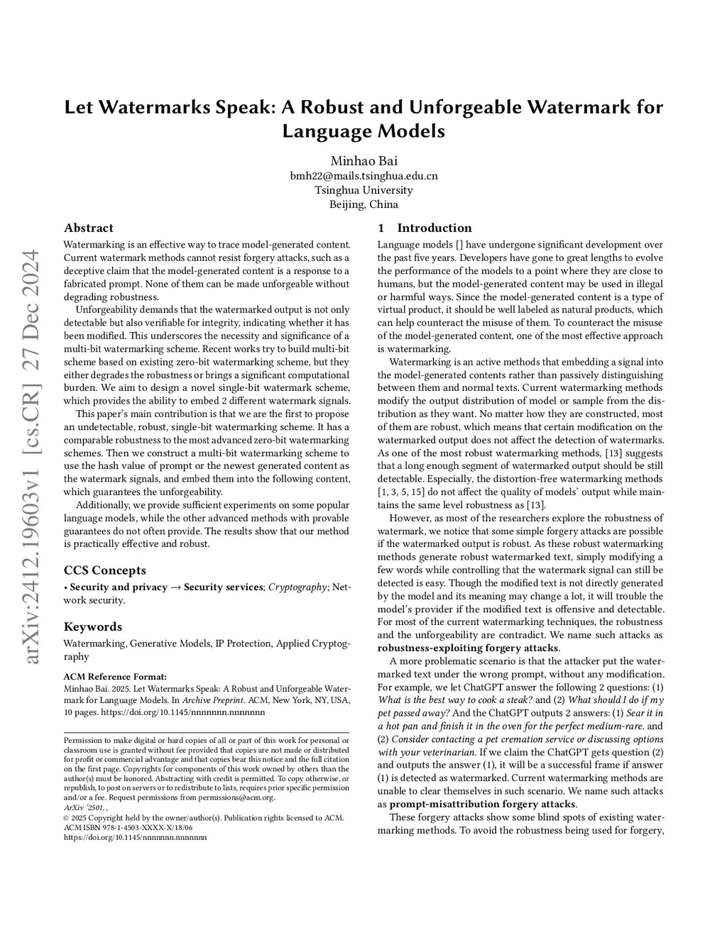Watermarking is an effective way to trace model-generated content. Current watermark methods cannot resist forgery attacks, such as a deceptive claim that the model-generated content is a response to a fabricated prompt. None of them can be made unforgeable without degrading robustness. Unforgeability demands that the watermarked output is not only detectable but also verifiable for integrity, indicating whether it has been modified. This underscores the necessity and significance of a multi-bit watermarking scheme. Recent works try to build multi-bit scheme based on existing zero-bit watermarking scheme, but they either degrades the robustness or brings a significant computational burden. We aim to design a novel single-bit watermark scheme, which provides the ability to embed 2 different watermark signals. This paper's main contribution is that we are the first to propose an undetectable, robust, single-bit watermarking scheme. It has a comparable robustness to the most advanced zero-bit watermarking schemes. Then we construct a multi-bit watermarking scheme to use the hash value of prompt or the newest generated content as the watermark signals, and embed them into the following content, which guarantees the unforgeability. Additionally, we provide sufficient experiments on some popular language models, while the other advanced methods with provable guarantees do not often provide. The results show that our method is practically effective and robust.