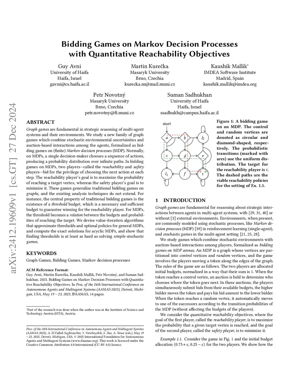 Graph games are fundamental in strategic reasoning of multi-agent systems and their environments. We study a new family of graph games which combine stochastic environmental uncertainties and auction-based interactions among the agents, formalized as bidding games on (finite) Markov decision processes (MDP). Normally, on MDPs, a single decision-maker chooses a sequence of actions, producing a probability distribution over infinite paths. In bidding games on MDPs, two players -- called the reachability and safety players -- bid for the privilege of choosing the next action at each step. The reachability player's goal is to maximize the probability of reaching a target vertex, whereas the safety player's goal is to minimize it. These games generalize traditional bidding games on graphs, and the existing analysis techniques do not extend. For instance, the central property of traditional bidding games is the existence of a threshold budget, which is a necessary and sufficient budget to guarantee winning for the reachability player. For MDPs, the threshold becomes a relation between the budgets and probabilities of reaching the target. We devise value-iteration algorithms that approximate thresholds and optimal policies for general MDPs, and compute the exact solutions for acyclic MDPs, and show that finding thresholds is at least as hard as solving simple-stochastic games.
