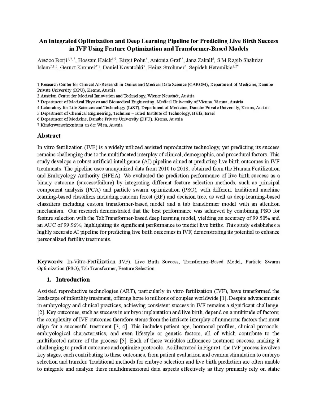 In vitro fertilization (IVF) is a widely utilized assisted reproductive technology, yet predicting its success remains challenging due to the multifaceted interplay of clinical, demographic, and procedural factors. This study develops a robust artificial intelligence (AI) pipeline aimed at predicting live birth outcomes in IVF treatments. The pipeline uses anonymized data from 2010 to 2018, obtained from the Human Fertilization and Embryology Authority (HFEA). We evaluated the prediction performance of live birth success as a binary outcome (success/failure) by integrating different feature selection methods, such as principal component analysis (PCA) and particle swarm optimization (PSO), with different traditional machine learning-based classifiers including random forest (RF) and decision tree, as well as deep learning-based classifiers including custom transformer-based model and a tab transformer model with an attention mechanism. Our research demonstrated that the best performance was achieved by combining PSO for feature selection with the TabTransformer-based deep learning model, yielding an accuracy of 99.50% and an AUC of 99.96%, highlighting its significant performance to predict live births. This study establishes a highly accurate AI pipeline for predicting live birth outcomes in IVF, demonstrating its potential to enhance personalized fertility treatments.