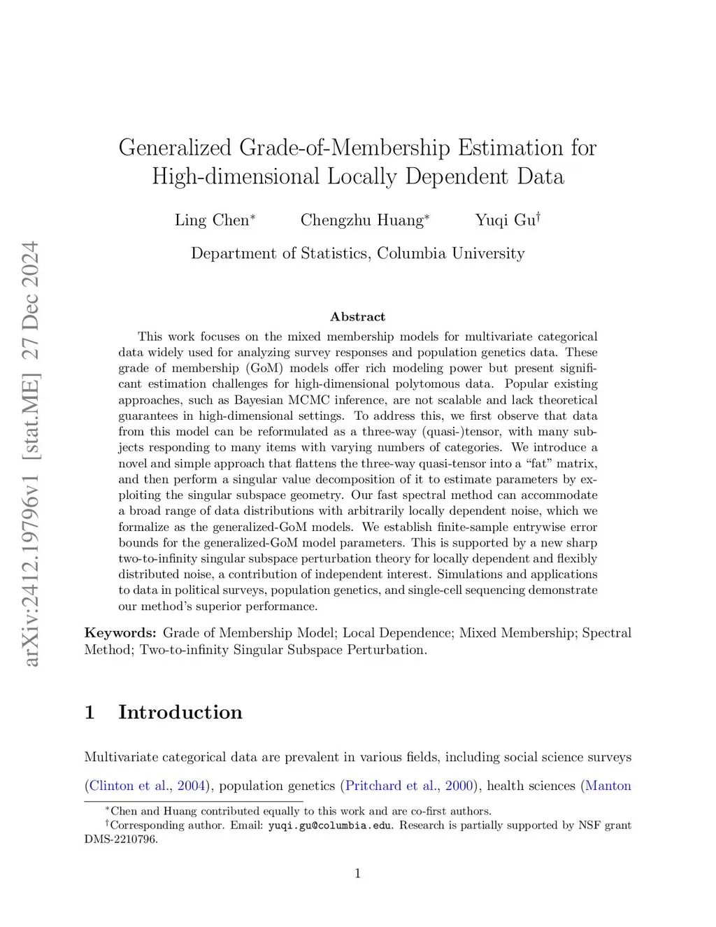 This work focuses on the mixed membership models for multivariate categorical data widely used for analyzing survey responses and population genetics data. These grade of membership (GoM) models offer rich modeling power but present significant estimation challenges for high-dimensional polytomous data. Popular existing approaches, such as Bayesian MCMC inference, are not scalable and lack theoretical guarantees in high-dimensional settings. To address this, we first observe that data from this model can be reformulated as a three-way (quasi-)tensor, with many subjects responding to many items with varying numbers of categories. We introduce a novel and simple approach that flattens the three-way quasi-tensor into a "fat" matrix, and then perform a singular value decomposition of it to estimate parameters by exploiting the singular subspace geometry. Our fast spectral method can accommodate a broad range of data distributions with arbitrarily locally dependent noise, which we formalize as the generalized-GoM models. We establish finite-sample entrywise error bounds for the generalized-GoM model parameters. This is supported by a new sharp two-to-infinity singular subspace perturbation theory for locally dependent and flexibly distributed noise, a contribution of independent interest. Simulations and applications to data in political surveys, population genetics, and single-cell sequencing demonstrate our method's superior performance.