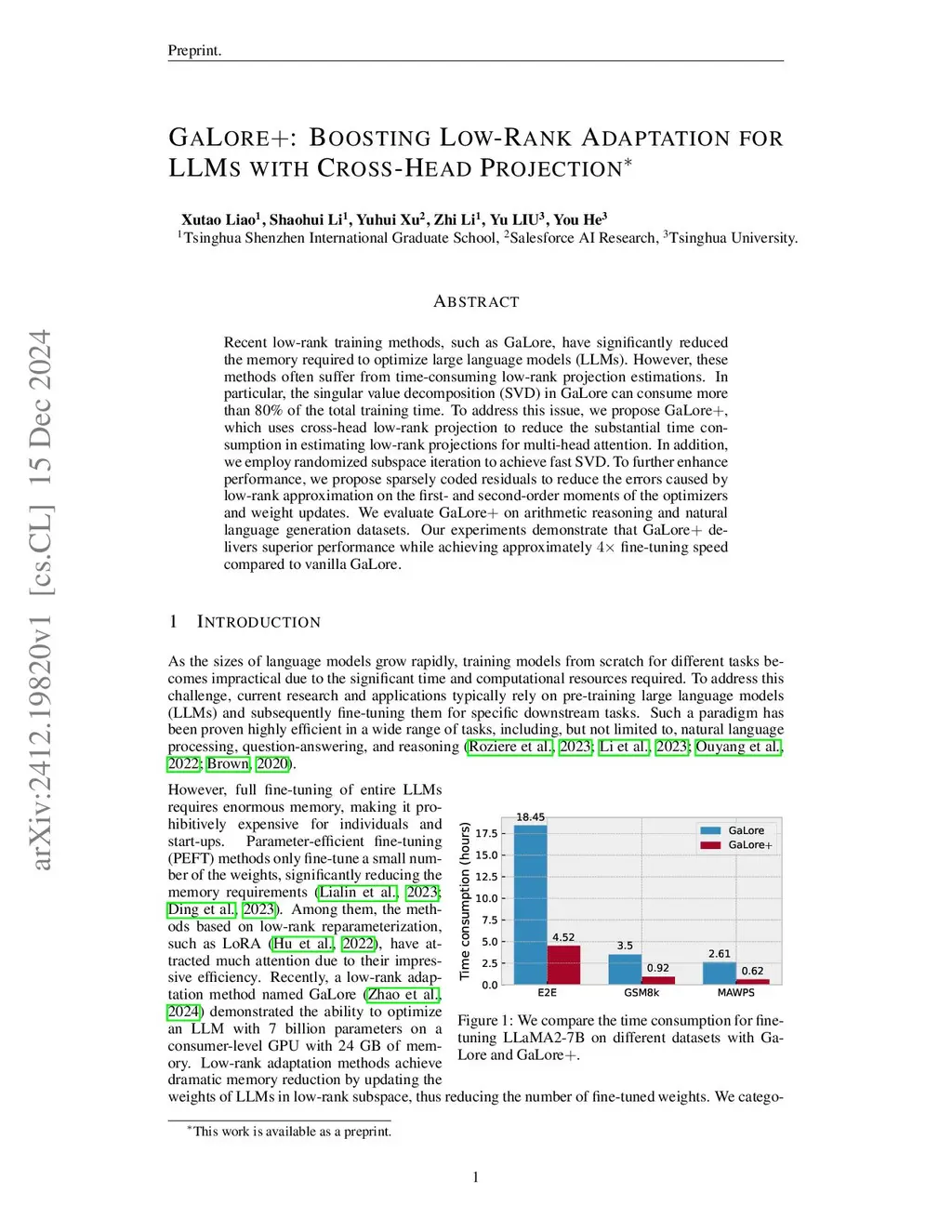 Recent low-rank training methods, such as GaLore, have significantly reduced the memory required to optimize large language models (LLMs). However, these methods often suffer from time-consuming low-rank projection estimations. In particular, the singular value decomposition (SVD) in GaLore can consume more than 80\% of the total training time. To address this issue, we propose GaLore, which uses cross-head low-rank projection to reduce the substantial time consumption in estimating low-rank projections for multi-head attention. In addition, we employ randomized subspace iteration to achieve fast SVD. To further enhance performance, we propose sparsely coded residuals to reduce the errors caused by low-rank approximation on the first- and second-order moments of the optimizers and weight updates. We evaluate GaLore on arithmetic reasoning and natural language generation datasets. Our experiments demonstrate that GaLore delivers superior performance while achieving approximately fine-tuning speed compared to vanilla GaLore.