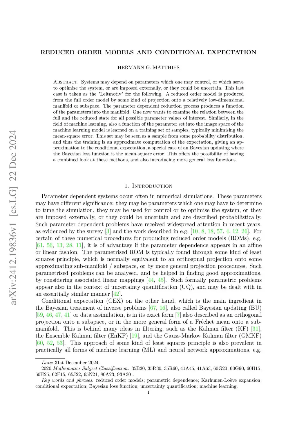 Systems may depend on parameters which one may control, or which serve to optimise the system, or are imposed externally, or they could be uncertain. This last case is taken as the ``Leitmotiv'' for the following. A reduced order model is produced from the full order model by some kind of projection onto a relatively low-dimensional manifold or subspace. The parameter dependent reduction process produces a function of the parameters into the manifold. One now wants to examine the relation between the full and the reduced state for all possible parameter values of interest. Similarly, in the field of machine learning, also a function of the parameter set into the image space of the machine learning model is learned on a training set of samples, typically minimising the mean-square error. This set may be seen as a sample from some probability distribution, and thus the training is an approximate computation of the expectation, giving an approximation to the conditional expectation, a special case of an Bayesian updating where the Bayesian loss function is the mean-square error. This offers the possibility of having a combined look at these methods, and also of introducing more general loss functions.