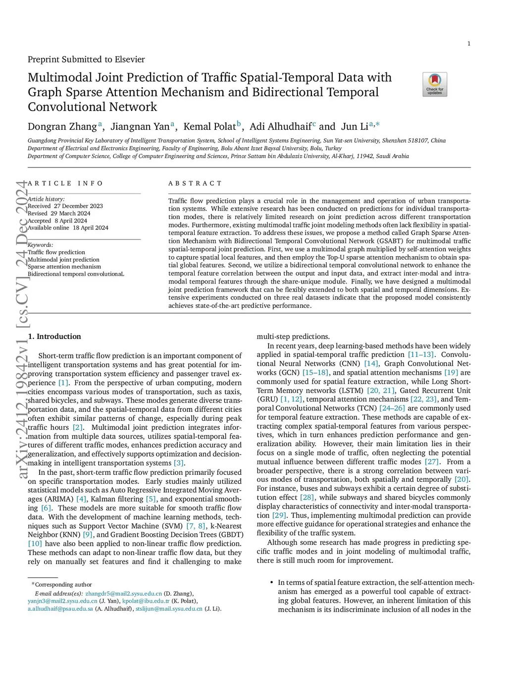 Multimodal joint prediction of traffic spatial-temporal data with graph sparse attention mechanism and bidirectional temporal convolutional network