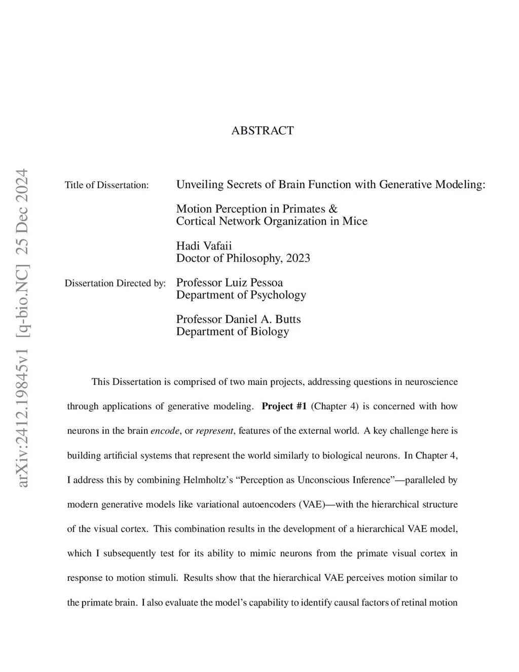 This Dissertation is comprised of two main projects, addressing questions in neuroscience through applications of generative modeling.Project #1 (Chapter 4) explores how neurons encode features of the external world. I combine Helmholtz's "Perception as Unconscious Inference" -- paralleled by modern generative models like variational autoencoders (VAE) -- with the hierarchical structure of the visual cortex. This combination leads to the development of a hierarchical VAE model, which I test for its ability to mimic neurons from the primate visual cortex in response to motion stimuli. Results show that the hierarchical VAE perceives motion similar to the primate brain. Additionally, the model identifies causal factors of retinal motion inputs, such as object- and self-motion, in a completely unsupervised manner. Collectively, these results suggest that hierarchical inference underlines the brain's understanding of the world, and hierarchical VAEs can effectively model this understanding.Project #2 (Chapter 5) investigates the spatiotemporal structure of spontaneous brain activity and its reflection of brain states like rest. Using simultaneous fMRI and wide-field Ca2+ imaging data, this project demonstrates that the mouse cortex can be decomposed into overlapping communities, with around half of the cortical regions belonging to multiple communities. Comparisons reveal similarities and differences between networks inferred from fMRI and Ca2+ signals.The introduction (Chapter 1) is divided similarly to this abstract: sections 1.1 to 1.8 provide background information about Project #1, and sections 1.9 to 1.13 are related to Project #2. Chapter 2 includes historical background, Chapter 3 provides the necessary mathematical background, and finally, Chapter 6 contains concluding remarks and future directions.