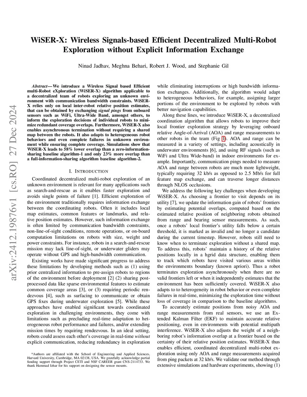 We introduce a Wireless Signal based Efficient multi-Robot eXploration (WiSER-X) algorithm applicable to a decentralized team of robots exploring an unknown environment with communication bandwidth constraints. WiSER-X relies only on local inter-robot relative position estimates, that can be obtained by exchanging signal pings from onboard sensors such as WiFi, Ultra-Wide Band, amongst others, to inform the exploration decisions of individual robots to minimize redundant coverage overlaps. Furthermore, WiSER-X also enables asynchronous termination without requiring a shared map between the robots. It also adapts to heterogeneous robot behaviors and even complete failures in unknown environment while ensuring complete coverage. Simulations show that WiSER-X leads to 58% lower overlap than a zero-information-sharing baseline algorithm-1 and only 23% more overlap than a full-information-sharing algorithm baseline algorithm-2. Hardware experiments further validate the feasibility of WiSER-X using full onboard sensing.