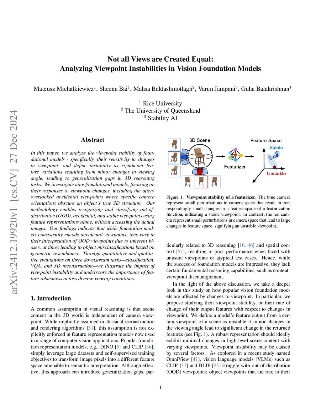 In this paper, we analyze the viewpoint stability of foundational models - specifically, their sensitivity to changes in viewpoint- and define instability as significant feature variations resulting from minor changes in viewing angle, leading to generalization gaps in 3D reasoning tasks. We investigate nine foundational models, focusing on their responses to viewpoint changes, including the often-overlooked accidental viewpoints where specific camera orientations obscure an object's true 3D structure. Our methodology enables recognizing and classifying out-of-distribution (OOD), accidental, and stable viewpoints using feature representations alone, without accessing the actual images. Our findings indicate that while foundation models consistently encode accidental viewpoints, they vary in their interpretation of OOD viewpoints due to inherent biases, at times leading to object misclassifications based on geometric resemblance. Through quantitative and qualitative evaluations on three downstream tasks - classification, VQA, and 3D reconstruction - we illustrate the impact of viewpoint instability and underscore the importance of feature robustness across diverse viewing conditions.