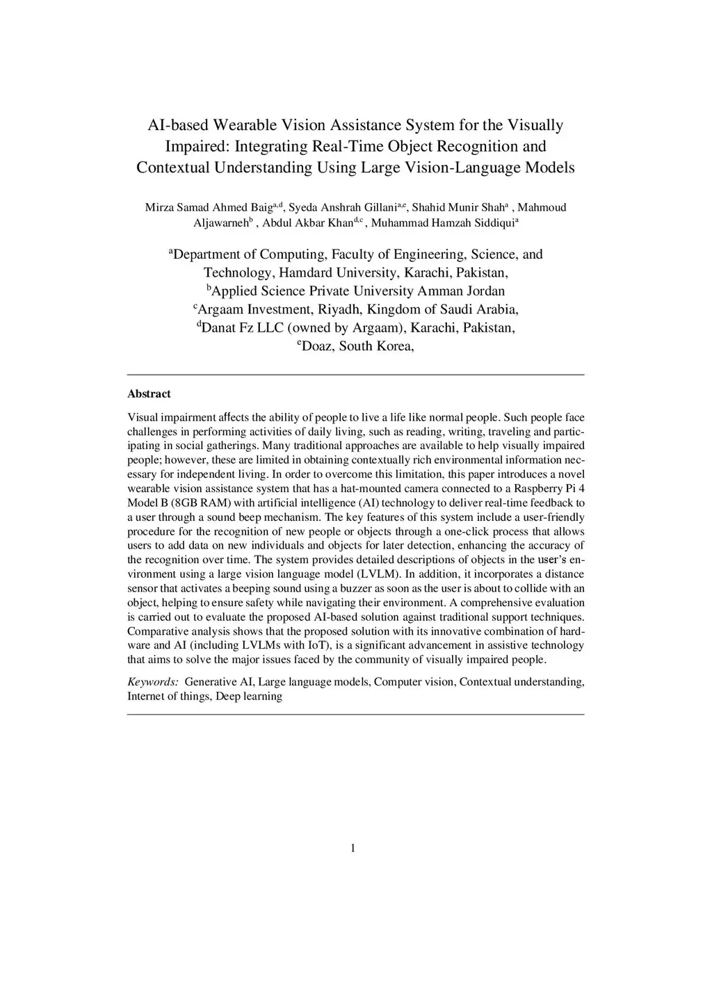 Visual impairment affects the ability of people to live a life like normal people. Such people face challenges in performing activities of daily living, such as reading, writing, traveling and participating in social gatherings. Many traditional approaches are available to help visually impaired people; however, these are limited in obtaining contextually rich environmental information necessary for independent living. In order to overcome this limitation, this paper introduces a novel wearable vision assistance system that has a hat-mounted camera connected to a Raspberry Pi 4 Model B (8GB RAM) with artificial intelligence (AI) technology to deliver real-time feedback to a user through a sound beep mechanism. The key features of this system include a user-friendly procedure for the recognition of new people or objects through a one-click process that allows users to add data on new individuals and objects for later detection, enhancing the accuracy of the recognition over time. The system provides detailed descriptions of objects in the user's environment using a large vision language model (LVLM). In addition, it incorporates a distance sensor that activates a beeping sound using a buzzer as soon as the user is about to collide with an object, helping to ensure safety while navigating their environment. A comprehensive evaluation is carried out to evaluate the proposed AI-based solution against traditional support techniques. Comparative analysis shows that the proposed solution with its innovative combination of hardware and AI (including LVLMs with IoT), is a significant advancement in assistive technology that aims to solve the major issues faced by the community of visually impaired people