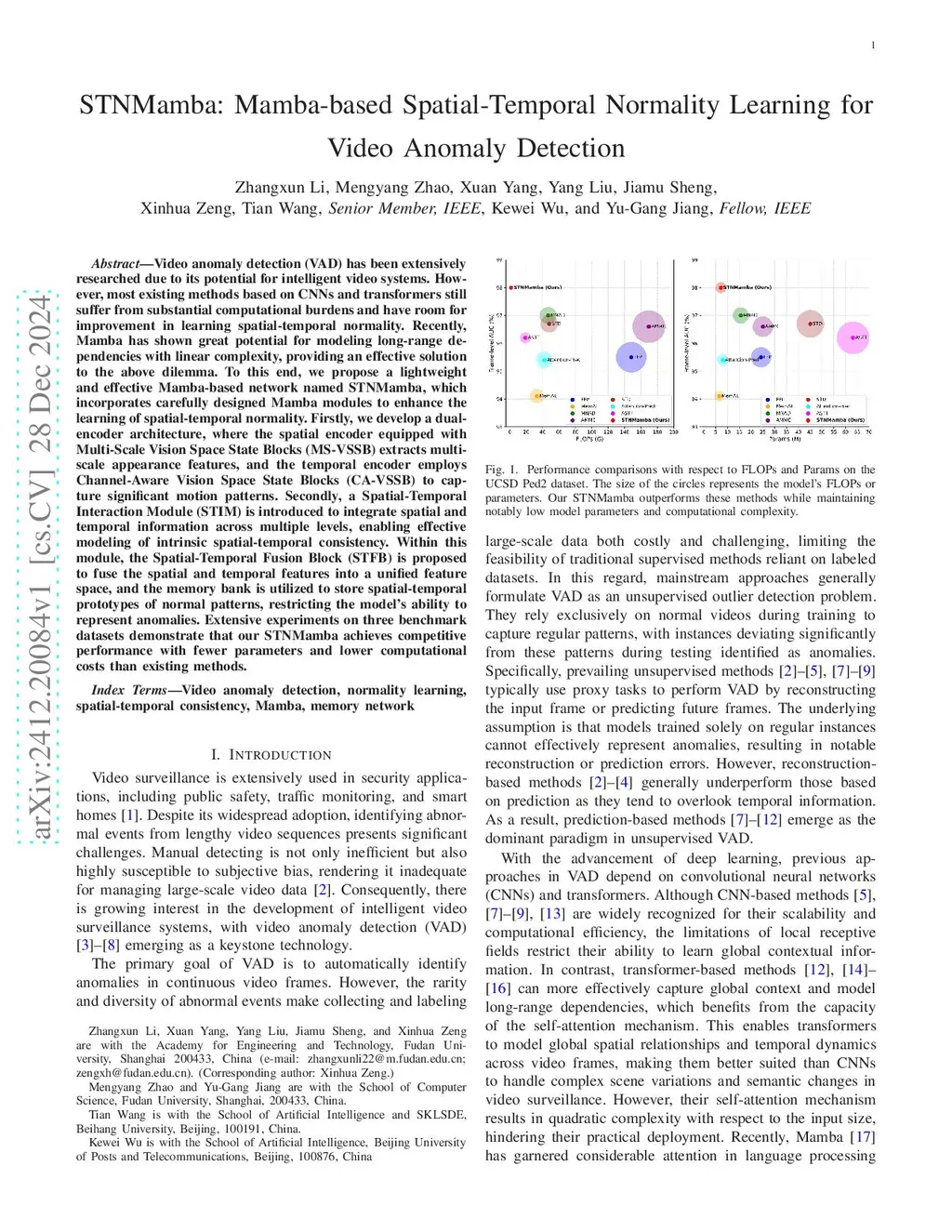 Video anomaly detection (VAD) has been extensively researched due to its potential for intelligent video systems. However, most existing methods based on CNNs and transformers still suffer from substantial computational burdens and have room for improvement in learning spatial-temporal normality. Recently, Mamba has shown great potential for modeling long-range dependencies with linear complexity, providing an effective solution to the above dilemma. To this end, we propose a lightweight and effective Mamba-based network named STNMamba, which incorporates carefully designed Mamba modules to enhance the learning of spatial-temporal normality. Firstly, we develop a dual-encoder architecture, where the spatial encoder equipped with Multi-Scale Vision Space State Blocks (MS-VSSB) extracts multi-scale appearance features, and the temporal encoder employs Channel-Aware Vision Space State Blocks (CA-VSSB) to capture significant motion patterns. Secondly, a Spatial-Temporal Interaction Module (STIM) is introduced to integrate spatial and temporal information across multiple levels, enabling effective modeling of intrinsic spatial-temporal consistency. Within this module, the Spatial-Temporal Fusion Block (STFB) is proposed to fuse the spatial and temporal features into a unified feature space, and the memory bank is utilized to store spatial-temporal prototypes of normal patterns, restricting the model's ability to represent anomalies. Extensive experiments on three benchmark datasets demonstrate that our STNMamba achieves competitive performance with fewer parameters and lower computational costs than existing methods.