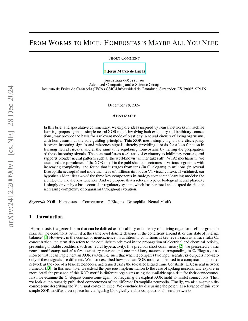 In this brief and speculative commentary, we explore ideas inspired by neural networks in machine learning, proposing that a simple neural XOR motif, involving both excitatory and inhibitory connections, may provide the basis for a relevant mode of plasticity in neural circuits of living organisms, with homeostasis as the sole guiding principle. This XOR motif simply signals the discrepancy between incoming signals and reference signals, thereby providing a basis for a loss function in learning neural circuits, and at the same time regulating homeostasis by halting the propagation of these incoming signals. The core motif uses a 4:1 ratio of excitatory to inhibitory neurons, and supports broader neural patterns such as the well-known 'winner takes all' (WTA) mechanism. We examined the prevalence of the XOR motif in the published connectomes of various organisms with increasing complexity, and found that it ranges from tens (in C. elegans) to millions (in several Drosophila neuropils) and more than tens of millions (in mouse V1 visual cortex). If validated, our hypothesis identifies two of the three key components in analogy to machine learning models: the architecture and the loss function. And we propose that a relevant type of biological neural plasticity is simply driven by a basic control or regulatory system, which has persisted and adapted despite the increasing complexity of organisms throughout evolution.