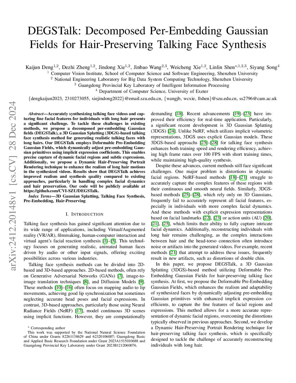 Accurately synthesizing talking face videos and capturing fine facial features for individuals with long hair presents a significant challenge. To tackle these challenges in existing methods, we propose a decomposed per-embedding Gaussian fields (DEGSTalk), a 3D Gaussian Splatting (3DGS)-based talking face synthesis method for generating realistic talking faces with long hairs. Our DEGSTalk employs Deformable Pre-Embedding Gaussian Fields, which dynamically adjust pre-embedding Gaussian primitives using implicit expression coefficients. This enables precise capture of dynamic facial regions and subtle expressions. Additionally, we propose a Dynamic Hair-Preserving Portrait Rendering technique to enhance the realism of long hair motions in the synthesized videos. Results show that DEGSTalk achieves improved realism and synthesis quality compared to existing approaches, particularly in handling complex facial dynamics and hair preservation. Our code will be publicly available atthis https URL.