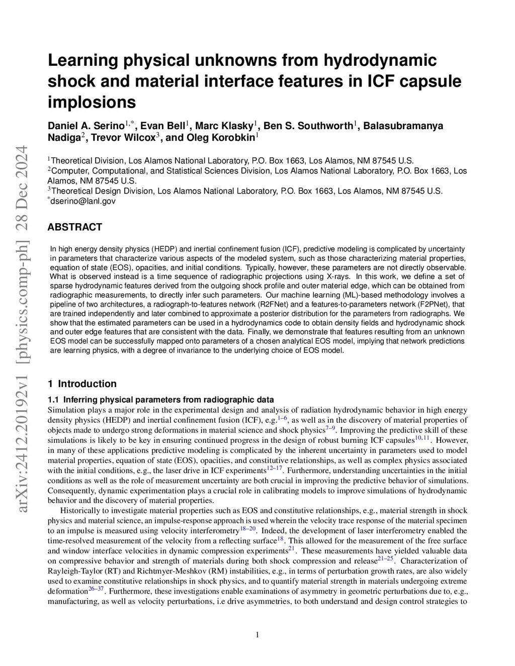 In high energy density physics (HEDP) and inertial confinement fusion (ICF), predictive modeling is complicated by uncertainty in parameters that characterize various aspects of the modeled system, such as those characterizing material properties, equation of state (EOS), opacities, and initial conditions. Typically, however, these parameters are not directly observable. What is observed instead is a time sequence of radiographic projections using X-rays. In this work, we define a set of sparse hydrodynamic features derived from the outgoing shock profile and outer material edge, which can be obtained from radiographic measurements, to directly infer such parameters. Our machine learning (ML)-based methodology involves a pipeline of two architectures, a radiograph-to-features network (R2FNet) and a features-to-parameters network (F2PNet), that are trained independently and later combined to approximate a posterior distribution for the parameters from radiographs. We show that the estimated parameters can be used in a hydrodynamics code to obtain density fields and hydrodynamic shock and outer edge features that are consistent with the data. Finally, we demonstrate that features resulting from an unknown EOS model can be successfully mapped onto parameters of a chosen analytical EOS model, implying that network predictions are learning physics, with a degree of invariance to the underlying choice of EOS model.