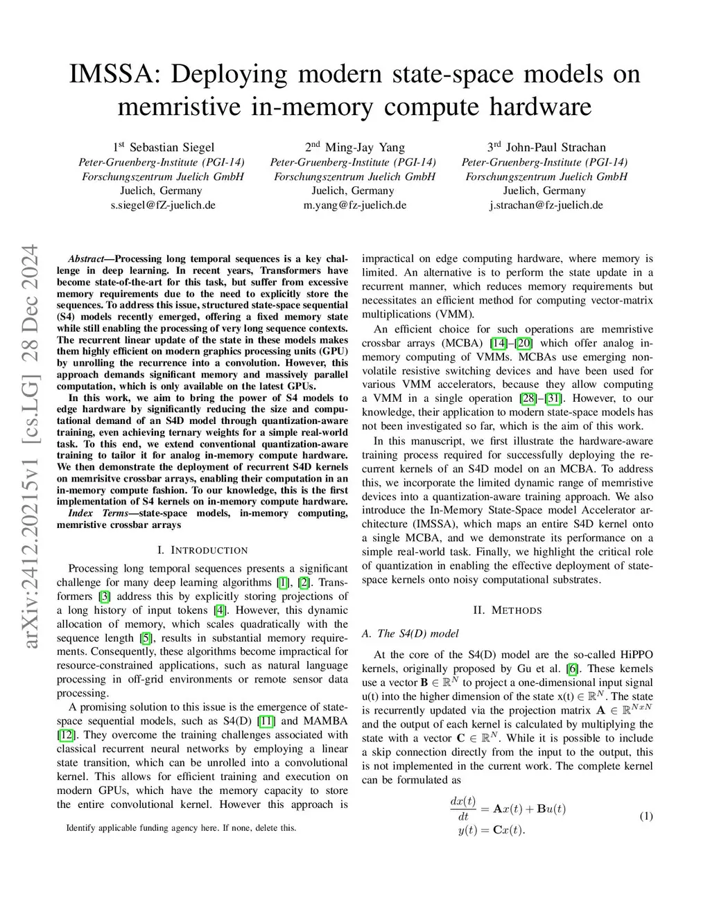 IMSSA: Deploying modern state-space models on memristive in-memory compute hardware