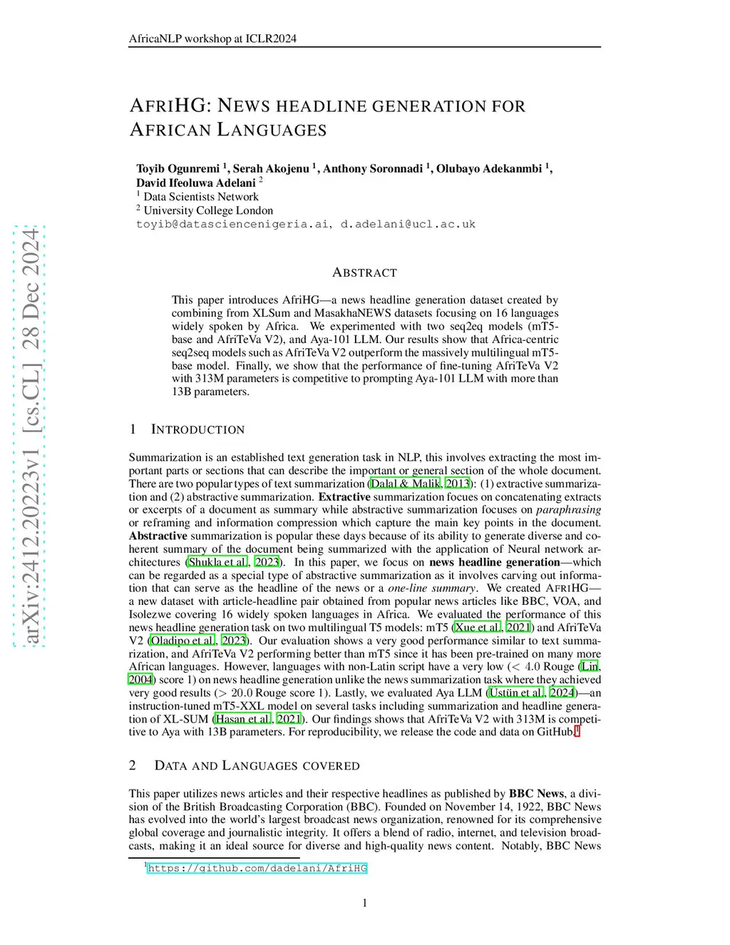 AfriHG: News headline generation for African Languages