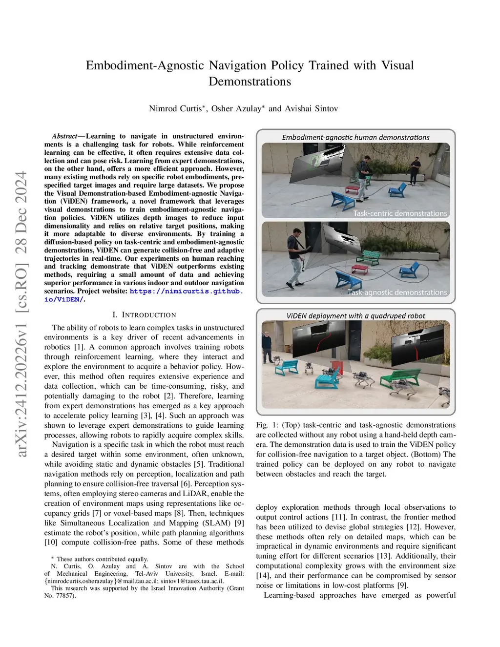 Learning to navigate in unstructured environments is a challenging task for robots. While reinforcement learning can be effective, it often requires extensive data collection and can pose risk. Learning from expert demonstrations, on the other hand, offers a more efficient approach. However, many existing methods rely on specific robot embodiments, pre-specified target images and require large datasets. We propose the Visual Demonstration-based Embodiment-agnostic Navigation (ViDEN) framework, a novel framework that leverages visual demonstrations to train embodiment-agnostic navigation policies. ViDEN utilizes depth images to reduce input dimensionality and relies on relative target positions, making it more adaptable to diverse environments. By training a diffusion-based policy on task-centric and embodiment-agnostic demonstrations, ViDEN can generate collision-free and adaptive trajectories in real-time. Our experiments on human reaching and tracking demonstrate that ViDEN outperforms existing methods, requiring a small amount of data and achieving superior performance in various indoor and outdoor navigation scenarios. Project website:this https URL.