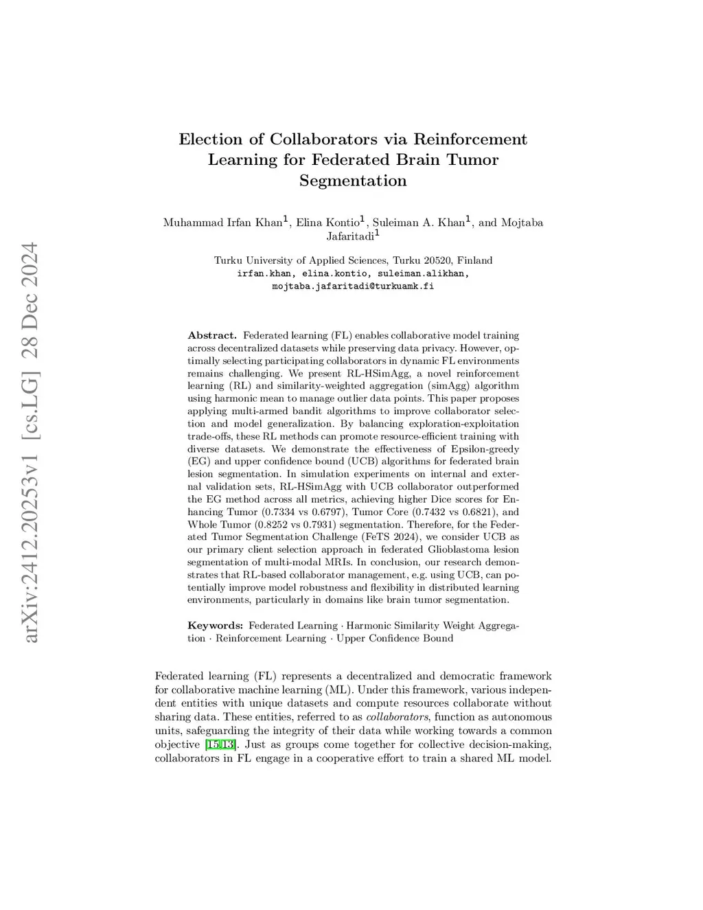 Federated learning (FL) enables collaborative model training across decentralized datasets while preserving data privacy. However, optimally selecting participating collaborators in dynamic FL environments remains challenging. We present RL-HSimAgg, a novel reinforcement learning (RL) and similarity-weighted aggregation (simAgg) algorithm using harmonic mean to manage outlier data points. This paper proposes applying multi-armed bandit algorithms to improve collaborator selection and model generalization. By balancing exploration-exploitation trade-offs, these RL methods can promote resource-efficient training with diverse datasets. We demonstrate the effectiveness of Epsilon-greedy (EG) and upper confidence bound (UCB) algorithms for federated brain lesion segmentation. In simulation experiments on internal and external validation sets, RL-HSimAgg with UCB collaborator outperformed the EG method across all metrics, achieving higher Dice scores for Enhancing Tumor (0.7334 vs 0.6797), Tumor Core (0.7432 vs 0.6821), and Whole Tumor (0.8252 vs 0.7931) segmentation. Therefore, for the Federated Tumor Segmentation Challenge (FeTS 2024), we consider UCB as our primary client selection approach in federated Glioblastoma lesion segmentation of multi-modal MRIs. In conclusion, our research demonstrates that RL-based collaborator management, e.g. using UCB, can potentially improve model robustness and flexibility in distributed learning environments, particularly in domains like brain tumor segmentation.