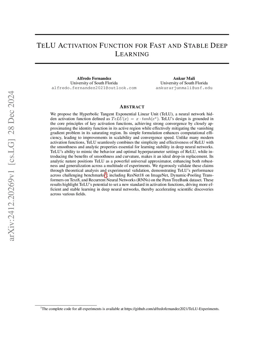 We propose the Hyperbolic Tangent Exponential Linear Unit (TeLU), a neural network hidden activation function defined as TeLU(x)=xtanh(exp(x)). TeLU's design is grounded in the core principles of key activation functions, achieving strong convergence by closely approximating the identity function in its active region while effectively mitigating the vanishing gradient problem in its saturating region. Its simple formulation enhances computational efficiency, leading to improvements in scalability and convergence speed. Unlike many modern activation functions, TeLU seamlessly combines the simplicity and effectiveness of ReLU with the smoothness and analytic properties essential for learning stability in deep neural networks. TeLU's ability to mimic the behavior and optimal hyperparameter settings of ReLU, while introducing the benefits of smoothness and curvature, makes it an ideal drop-in replacement. Its analytic nature positions TeLU as a powerful universal approximator, enhancing both robustness and generalization across a multitude of experiments. We rigorously validate these claims through theoretical analysis and experimental validation, demonstrating TeLU's performance across challenging benchmarks; including ResNet18 on ImageNet, Dynamic-Pooling Transformers on Text8, and Recurrent Neural Networks (RNNs) on the Penn TreeBank dataset. These results highlight TeLU's potential to set a new standard in activation functions, driving more efficient and stable learning in deep neural networks, thereby accelerating scientific discoveries across various fields.