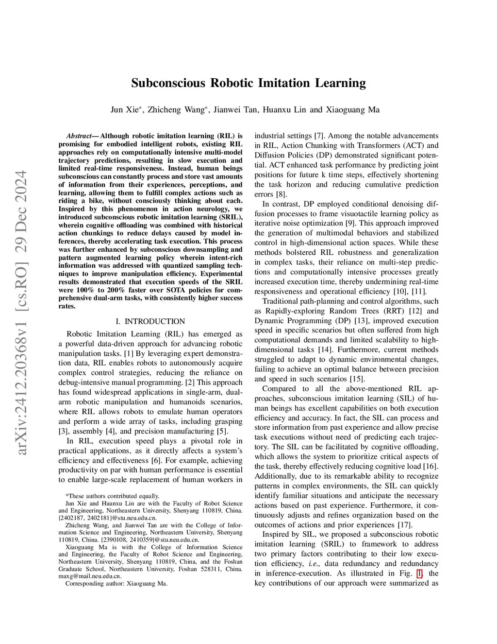 Although robotic imitation learning (RIL) is promising for embodied intelligent robots, existing RIL approaches rely on computationally intensive multi-model trajectory predictions, resulting in slow execution and limited real-time responsiveness. Instead, human beings subconscious can constantly process and store vast amounts of information from their experiences, perceptions, and learning, allowing them to fulfill complex actions such as riding a bike, without consciously thinking about each. Inspired by this phenomenon in action neurology, we introduced subconscious robotic imitation learning (SRIL), wherein cognitive offloading was combined with historical action chunkings to reduce delays caused by model inferences, thereby accelerating task execution. This process was further enhanced by subconscious downsampling and pattern augmented learning policy wherein intent-rich information was addressed with quantized sampling techniques to improve manipulation efficiency. Experimental results demonstrated that execution speeds of the SRIL were 100\% to 200\% faster over SOTA policies for comprehensive dual-arm tasks, with consistently higher success rates.