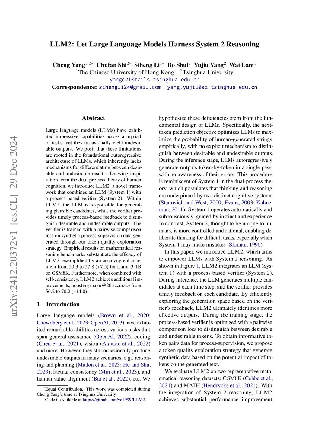 Large language models (LLMs) have exhibited impressive capabilities across a myriad of tasks, yet they occasionally yield undesirable outputs. We posit that these limitations are rooted in the foundational autoregressive architecture of LLMs, which inherently lacks mechanisms for differentiating between desirable and undesirable results. Drawing inspiration from the dual-process theory of human cognition, we introduce LLM2, a novel framework that combines an LLM (System 1) with a process-based verifier (System 2). Within LLM2, the LLM is responsible for generating plausible candidates, while the verifier provides timely process-based feedback to distinguish desirable and undesirable outputs. The verifier is trained with a pairwise comparison loss on synthetic process-supervision data generated through our token quality exploration strategy. Empirical results on mathematical reasoning benchmarks substantiate the efficacy of LLM2, exemplified by an accuracy enhancement from 50.3 to 57.8 (+7.5) for Llama3-1B on GSM8K. Furthermore, when combined with self-consistency, LLM2 achieves additional improvements, boosting major@20 accuracy from 56.2 to 70.2 (+14.0).