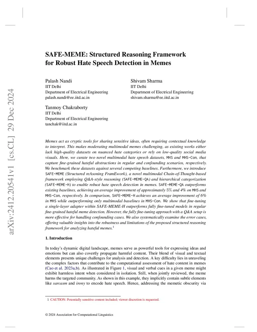 Memes act as cryptic tools for sharing sensitive ideas, often requiring contextual knowledge to interpret. This makes moderating multimodal memes challenging, as existing works either lack high-quality datasets on nuanced hate categories or rely on low-quality social media visuals. Here, we curate two novel multimodal hate speech datasets, MHS and MHS-Con, that capture fine-grained hateful abstractions in regular and confounding scenarios, respectively. We benchmark these datasets against several competing baselines. Furthermore, we introduce SAFE-MEME (Structured reAsoning FramEwork), a novel multimodal Chain-of-Thought-based framework employing Q&A-style reasoning (SAFE-MEME-QA) and hierarchical categorization (SAFE-MEME-H) to enable robust hate speech detection in memes. SAFE-MEME-QA outperforms existing baselines, achieving an average improvement of approximately 5% and 4% on MHS and MHS-Con, respectively. In comparison, SAFE-MEME-H achieves an average improvement of 6% in MHS while outperforming only multimodal baselines in MHS-Con. We show that fine-tuning a single-layer adapter within SAFE-MEME-H outperforms fully fine-tuned models in regular fine-grained hateful meme detection. However, the fully fine-tuning approach with a Q&A setup is more effective for handling confounding cases. We also systematically examine the error cases, offering valuable insights into the robustness and limitations of the proposed structured reasoning framework for analyzing hateful memes.