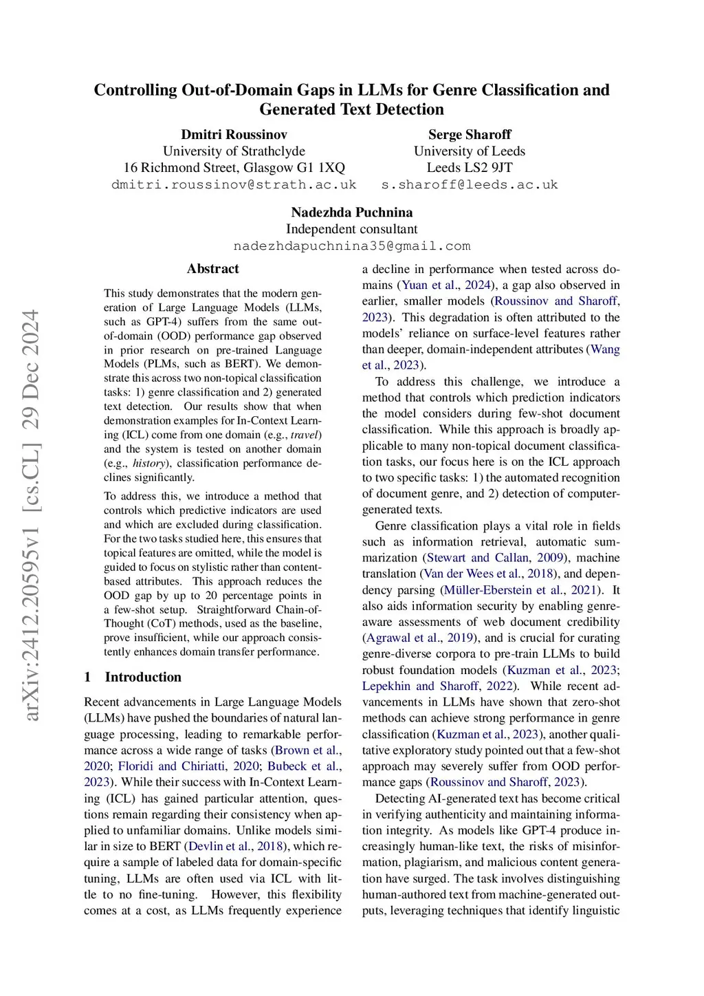 Controlling Out-of-Domain Gaps in LLMs for Genre Classification and Generated Text Detection