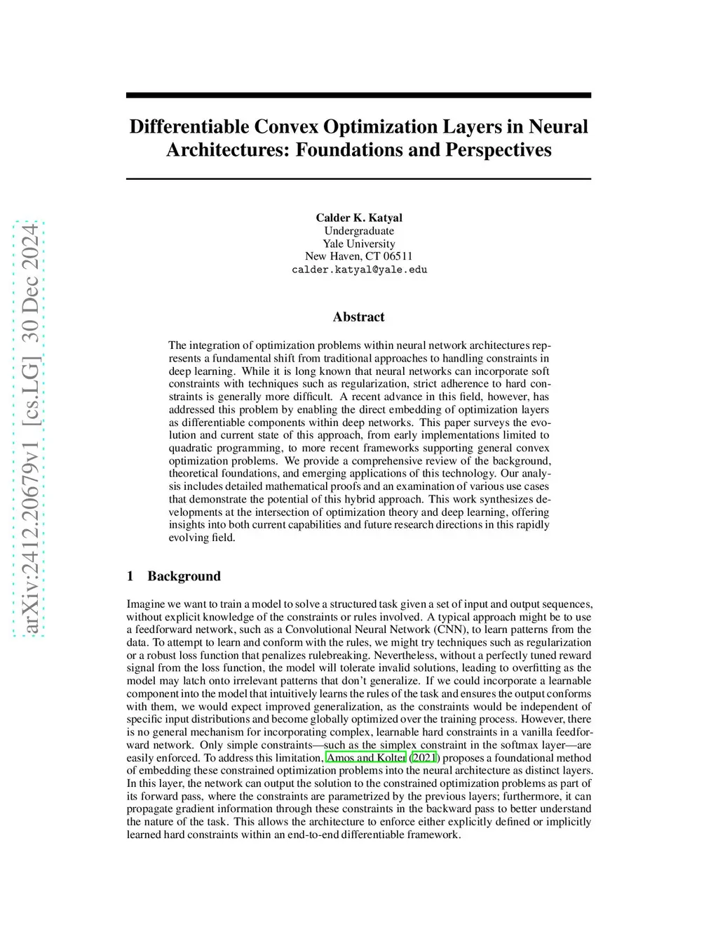 The integration of optimization problems within neural network architectures represents a fundamental shift from traditional approaches to handling constraints in deep learning. While it is long known that neural networks can incorporate soft constraints with techniques such as regularization, strict adherence to hard constraints is generally more difficult. A recent advance in this field, however, has addressed this problem by enabling the direct embedding of optimization layers as differentiable components within deep networks. This paper surveys the evolution and current state of this approach, from early implementations limited to quadratic programming, to more recent frameworks supporting general convex optimization problems. We provide a comprehensive review of the background, theoretical foundations, and emerging applications of this technology. Our analysis includes detailed mathematical proofs and an examination of various use cases that demonstrate the potential of this hybrid approach. This work synthesizes developments at the intersection of optimization theory and deep learning, offering insights into both current capabilities and future research directions in this rapidly evolving field.