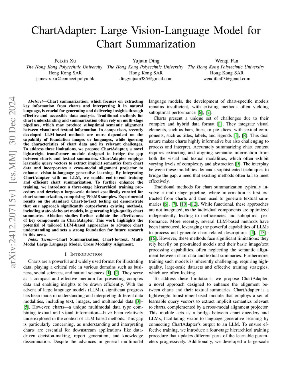 Chart summarization, which focuses on extracting key information from charts and interpreting it in natural language, is crucial for generating and delivering insights through effective and accessible data analysis. Traditional methods for chart understanding and summarization often rely on multi-stage pipelines, which may produce suboptimal semantic alignment between visual and textual information. In comparison, recently developed LLM-based methods are more dependent on the capability of foundation images or languages, while ignoring the characteristics of chart data and its relevant challenges. To address these limitations, we propose ChartAdapter, a novel lightweight transformer module designed to bridge the gap between charts and textual summaries. ChartAdapter employs learnable query vectors to extract implicit semantics from chart data and incorporates a cross-modal alignment projector to enhance vision-to-language generative learning. By integrating ChartAdapter with an LLM, we enable end-to-end training and efficient chart summarization. To further enhance the training, we introduce a three-stage hierarchical training procedure and develop a large-scale dataset specifically curated for chart summarization, comprising 190,618 samples. Experimental results on the standard Chart-to-Text testing set demonstrate that our approach significantly outperforms existing methods, including state-of-the-art models, in generating high-quality chart summaries. Ablation studies further validate the effectiveness of key components in ChartAdapter. This work highlights the potential of tailored LLM-based approaches to advance chart understanding and sets a strong foundation for future research in this area.