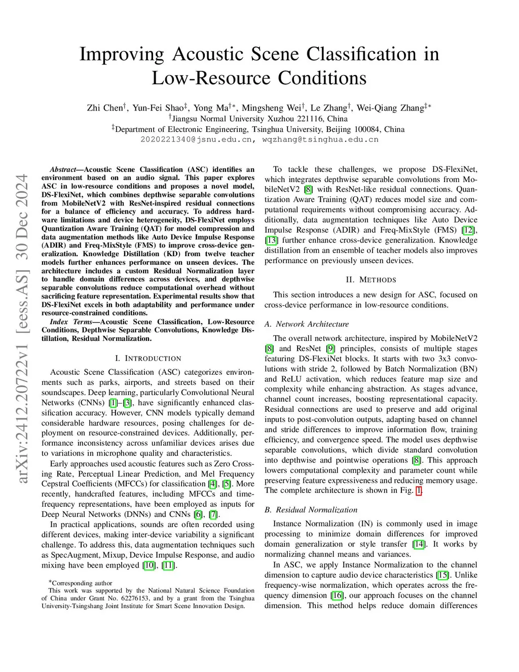 Acoustic Scene Classification (ASC) identifies an environment based on an audio signal. This paper explores ASC in low-resource conditions and proposes a novel model, DS-FlexiNet, which combines depthwise separable convolutions from MobileNetV2 with ResNet-inspired residual connections for a balance of efficiency and accuracy. To address hardware limitations and device heterogeneity, DS-FlexiNet employs Quantization Aware Training (QAT) for model compression and data augmentation methods like Auto Device Impulse Response (ADIR) and Freq-MixStyle (FMS) to improve cross-device generalization. Knowledge Distillation (KD) from twelve teacher models further enhances performance on unseen devices. The architecture includes a custom Residual Normalization layer to handle domain differences across devices, and depthwise separable convolutions reduce computational overhead without sacrificing feature representation. Experimental results show that DS-FlexiNet excels in both adaptability and performance under resource-constrained conditions.