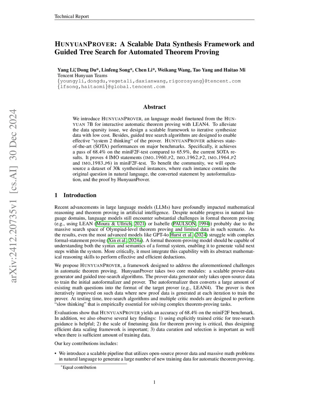 We introduce HunyuanProver, an language model finetuned from the Hunyuan 7B for interactive automatic theorem proving with LEAN4. To alleviate the data sparsity issue, we design a scalable framework to iterative synthesize data with low cost. Besides, guided tree search algorithms are designed to enable effective ``system 2 thinking`` of the prover. HunyuanProver achieves state-of-the-art (SOTA) performances on major benchmarks. Specifically, it achieves a pass of 68.4% on the miniF2F-test compared to 65.9%, the current SOTA results. It proves 4 IMO statements (imo_1960_p2, imo_1962_p2}, imo_1964_p2 and imo_1983_p6) in miniF2F-test. To benefit the community, we will open-source a dataset of 30k synthesized instances, where each instance contains the original question in natural language, the converted statement by autoformalization, and the proof by HunyuanProver.
