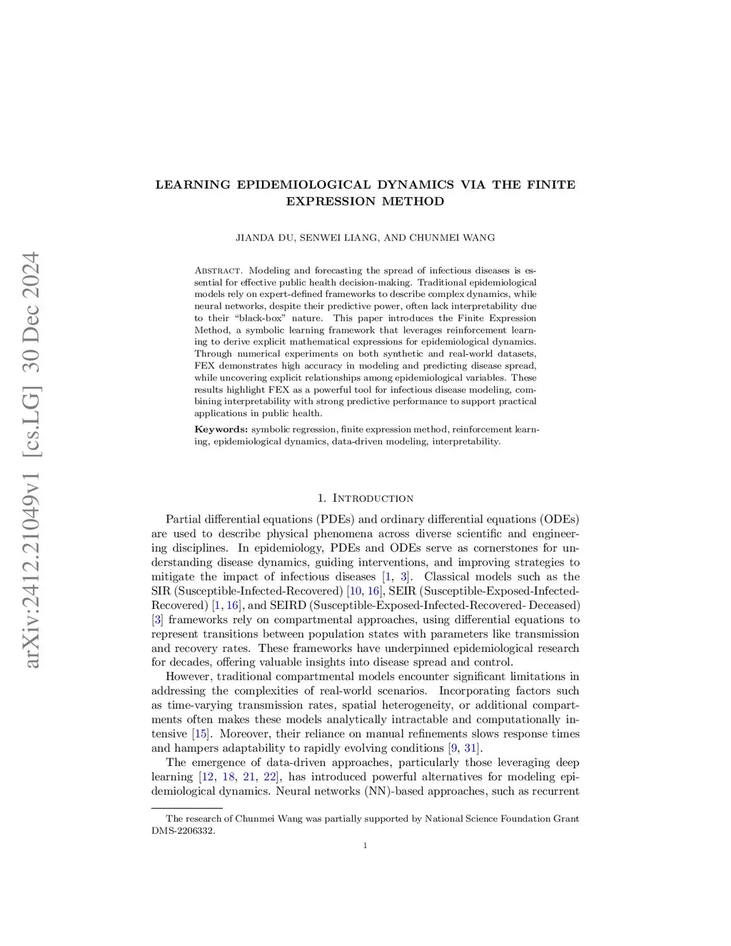 Modeling and forecasting the spread of infectious diseases is essential for effective public health decision-making. Traditional epidemiological models rely on expert-defined frameworks to describe complex dynamics, while neural networks, despite their predictive power, often lack interpretability due to their ``black-box" nature. This paper introduces the Finite Expression Method, a symbolic learning framework that leverages reinforcement learning to derive explicit mathematical expressions for epidemiological dynamics. Through numerical experiments on both synthetic and real-world datasets, FEX demonstrates high accuracy in modeling and predicting disease spread, while uncovering explicit relationships among epidemiological variables. These results highlight FEX as a powerful tool for infectious disease modeling, combining interpretability with strong predictive performance to support practical applications in public health.