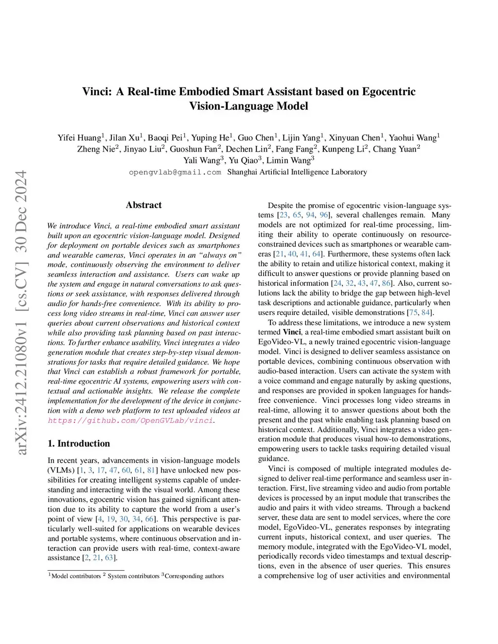 We introduce Vinci, a real-time embodied smart assistant built upon an egocentric vision-language model. Designed for deployment on portable devices such as smartphones and wearable cameras, Vinci operates in an "always on" mode, continuously observing the environment to deliver seamless interaction and assistance. Users can wake up the system and engage in natural conversations to ask questions or seek assistance, with responses delivered through audio for hands-free convenience. With its ability to process long video streams in real-time, Vinci can answer user queries about current observations and historical context while also providing task planning based on past interactions. To further enhance usability, Vinci integrates a video generation module that creates step-by-step visual demonstrations for tasks that require detailed guidance. We hope that Vinci can establish a robust framework for portable, real-time egocentric AI systems, empowering users with contextual and actionable insights. We release the complete implementation for the development of the device in conjunction with a demo web platform to test uploaded videos atthis https URL.