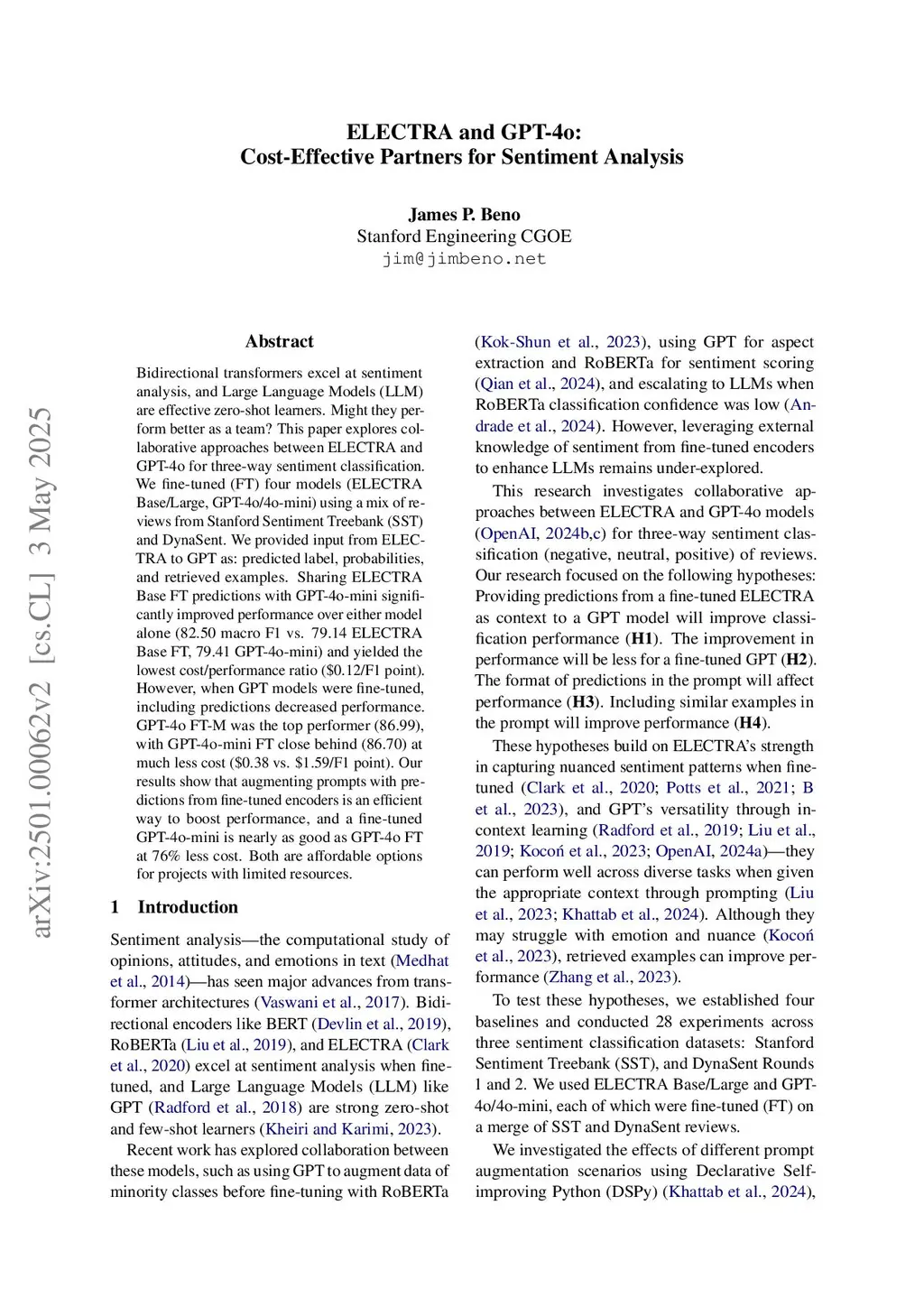 ELECTRA and GPT-4o: Cost-Effective Partners for Sentiment Analysis