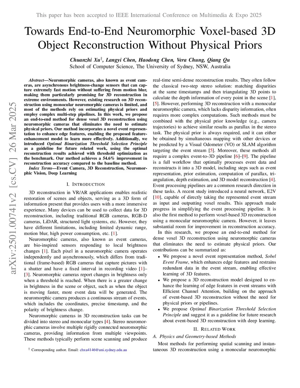 Neuromorphic cameras, also known as event cameras, are asynchronous brightness-change sensors that can capture extremely fast motion without suffering from motion blur, making them particularly promising for 3D reconstruction in extreme environments. However, existing research on 3D reconstruction using monocular neuromorphic cameras is limited, and most of the methods rely on estimating physical priors and employ complex multi-step pipelines. In this work, we propose an end-to-end method for dense voxel 3D reconstruction using neuromorphic cameras that eliminates the need to estimate physical priors. Our method incorporates a novel event representation to enhance edge features, enabling the proposed feature-enhancement model to learn more effectively. Additionally, we introduced Optimal Binarization Threshold Selection Principle as a guideline for future related work, using the optimal reconstruction results achieved with threshold optimization as the benchmark. Our method achieves a 54.6% improvement in reconstruction accuracy compared to the baseline method.