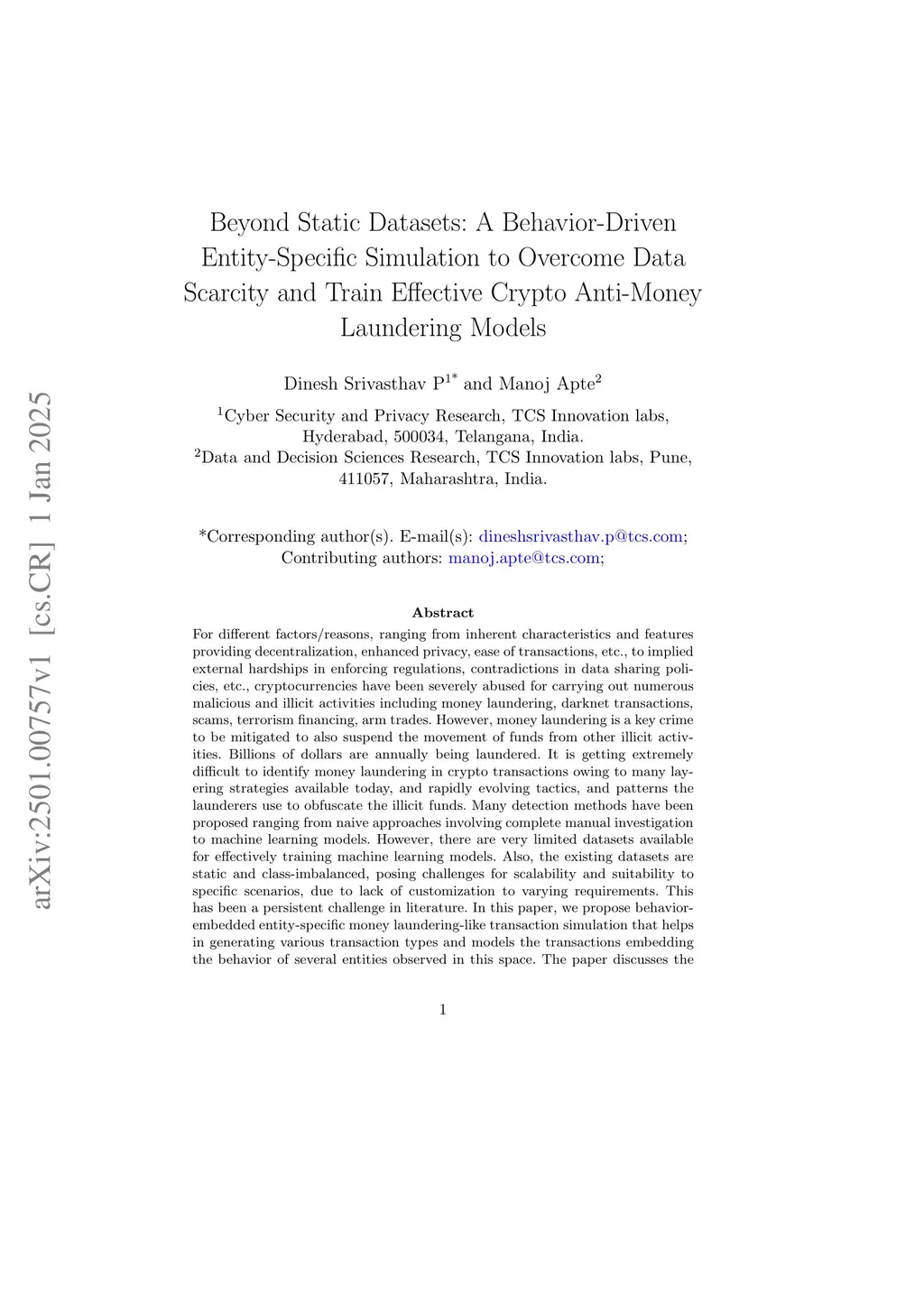 For different factors/reasons, ranging from inherent characteristics and features providing decentralization, enhanced privacy, ease of transactions, etc., to implied external hardships in enforcing regulations, contradictions in data sharing policies, etc., cryptocurrencies have been severely abused for carrying out numerous malicious and illicit activities including money laundering, darknet transactions, scams, terrorism financing, arm trades. However, money laundering is a key crime to be mitigated to also suspend the movement of funds from other illicit activities. Billions of dollars are annually being laundered. It is getting extremely difficult to identify money laundering in crypto transactions owing to many layering strategies available today, and rapidly evolving tactics, and patterns the launderers use to obfuscate the illicit funds. Many detection methods have been proposed ranging from naive approaches involving complete manual investigation to machine learning models. However, there are very limited datasets available for effectively training machine learning models. Also, the existing datasets are static and class-imbalanced, posing challenges for scalability and suitability to specific scenarios, due to lack of customization to varying requirements. This has been a persistent challenge in literature. In this paper, we propose behavior embedded entity-specific money laundering-like transaction simulation that helps in generating various transaction types and models the transactions embedding the behavior of several entities observed in this space. The paper discusses the design and architecture of the simulator, a custom dataset we generated using the simulator, and the performance of models trained on this synthetic data in detecting real addresses involved in money laundering.