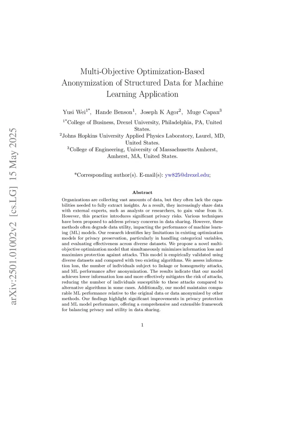 Multi-Objective Optimization-Based Anonymization of Structured Data for Machine Learning Application