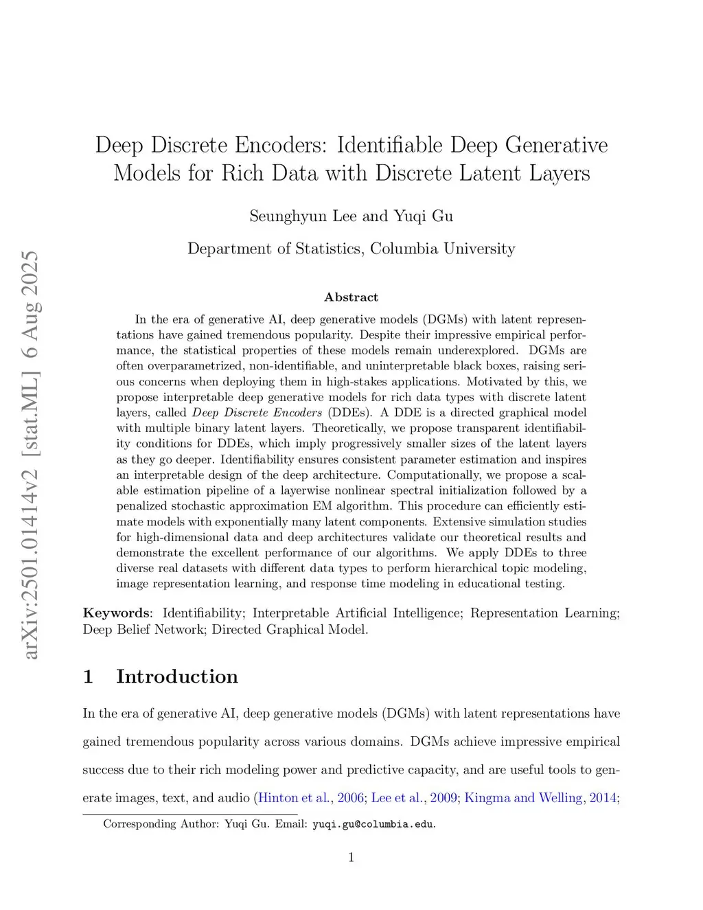 In the era of generative AI, deep generative models (DGMs) with latent representations have gained tremendous popularity. Despite their impressive empirical performance, the statistical properties of these models remain underexplored. DGMs are often overparametrized, non-identifiable, and uninterpretable black boxes, raising serious concerns when deploying them in high-stakes applications. Motivated by this, we propose interpretable deep generative models for rich data types with discrete latent layers, called Deep Discrete Encoders (DDEs). A DDE is a directed graphical model with multiple binary latent layers. Theoretically, we propose transparent identifiability conditions for DDEs, which imply progressively smaller sizes of the latent layers as they go deeper. Identifiability ensures consistent parameter estimation and inspires an interpretable design of the deep architecture. Computationally, we propose a scalable estimation pipeline of a layerwise nonlinear spectral initialization followed by a penalized stochastic approximation EM algorithm. This procedure can efficiently estimate models with exponentially many latent components. Extensive simulation studies for high-dimensional data and deep architectures validate our theoretical results and demonstrate the excellent performance of our algorithms. We apply DDEs to three diverse real datasets with different data types to perform hierarchical topic modeling, image representation learning, and response time modeling in educational testing.
